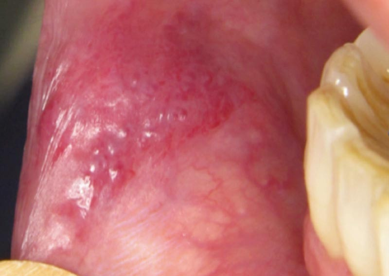 Motif de la consultation. Patiente de 33 ans qui a consulté après la découverte d’une plaque rouge sur la lèvre inférieure droite.