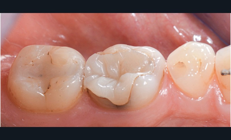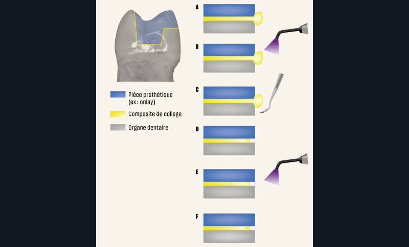 Lors du collage d’une restauration indirecte, de nombreux protocoles cliniques proposent une polymérisation flash de 2 ou 3 secondes suivie par l’élimination de la résine en excès à l’aide d’une curette, d’une sonde ou tout autre instrument, puis une nouvelle polymérisation plus longue est effectuée. Bien que ce protocole puisse sembler séduisant car il permet d’éliminer plus facilement les excès de colle, il est à proscrire car il induit un joint de mauvaise qualité en arrachant de la colle non assez polymérisée à l’intérieur du joint. Il en résulte souvent un joint qui n’est pas en continuité avec la dent, et la restauration devient source de coloration, de rétention de plaque dentaire, de biofilm bactérien dont l’acidité contribue à la dégradation du joint [97]. En conclusion, il faut proscrire les polymérisations « flash » (fig. 11 et 12).