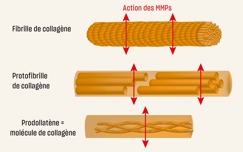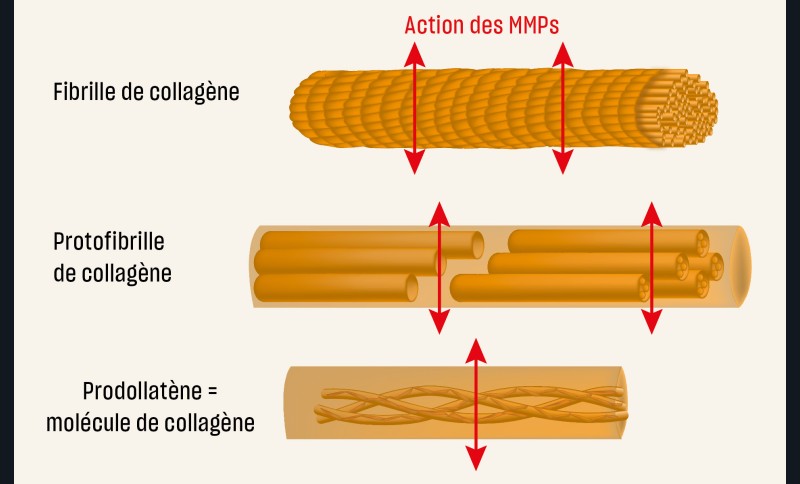 Les fibres de collagène peuvent être le siège d’une dégradation par l’action protéolytique d’enzymes d’origine bactérienne, salivaire et endogène [48-54].