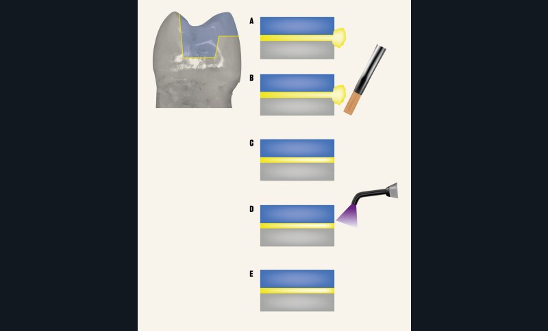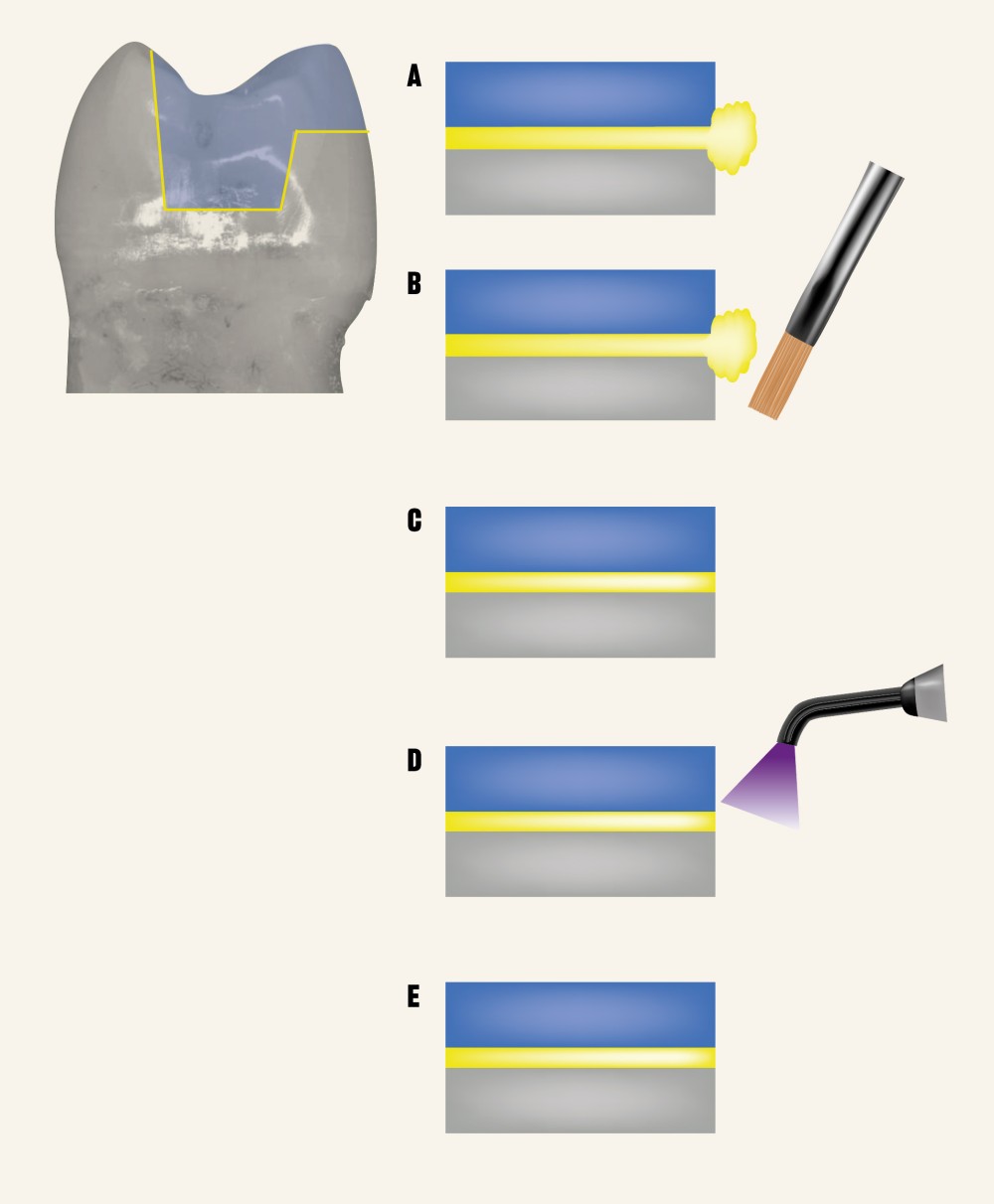 Une couche d’adhésif bien polymérisée, améliorant le taux de conversion de la résine adhésive, est une condition fondamentale à la stabilité à long terme de l’interface collée [83]. Il est important de ne pas négliger l’étape de photopolymérisation et de ne pas réduire son temps. De plus, le système adhésif doit toujours être photopolymérisé séparément et avant l’application de composite (restauration ou de collage) dès qu’il est appliqué sur de la dentine. En effet, l’absorption par osmose de l’humidité de la dentine par la surface de l’adhésif est ainsi réduite ou bloquée [92, 93, 94]. La photopolymérisation de la couche adhésive doit être effectuée rapidement après son application, sinon, des gouttelettes d’eau finissent par s’incorporer dans l’interface de l’adhésif [95, 96]. Ces gouttelettes et les pores qu’elles produisent affaiblissent l’interface collée et diminuent la longévité clinique des restaurations [81].