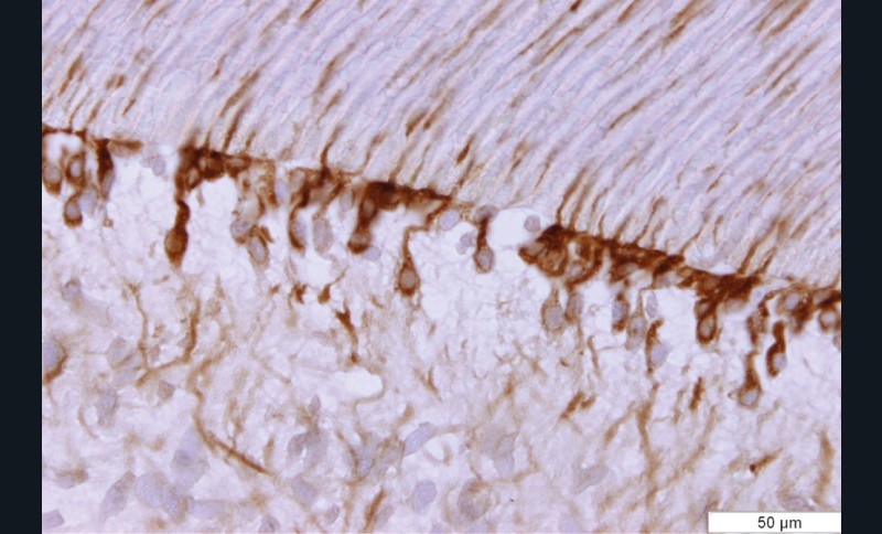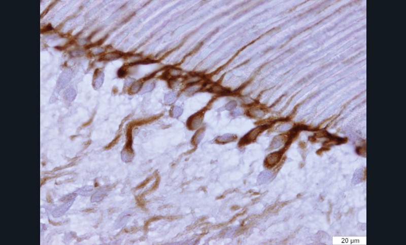 Par ailleurs, la capacité des systèmes adhésifs amélo-dentinaires à induire une augmentation de proMMP-9, proMMP-2 et MMP-2 dans le complexe pulpo-dentinaire ainsi qu’une augmentation significative de l’expression de MMP-2 au sein des odontoblastes [56] (fig. 6 et 7) ont été mis en évidence in vitro et ex vivo. Deux hypothèses ont été proposées par ces auteurs pour expliquer cette activation [56] : la première correspond à celle déjà utilisée pour expliquer les réactions dentinogénétiques sous lésion carieuse. La déminéralisation acide de la dentine par les systèmes adhésifs permettrait la solubilisation de certains facteurs de croissance (tels que TGF-β1, -2, -3, BMPs, IGF-I, -II, PDGF) [57- 59]. Celle-ci serait suivie de la diffusion intratubulaire des facteurs en direction du tissu pulpaire et de la stimulation des cellules odontoblastiques et pulpaires périphériques situées à l’extrémité interne des tubules. Cette hypothèse est renforcée par plusieurs études qui ont démontré que l’expression des MMPs était régulée par TGF-β1 et certaines BMPs (Bone morpho protein) [60, 61]. La seconde hypothèse serait que des résidus de monomères acides non ou mal polymérisés ou des protons issus de l’ionisation des monomères pourraient diffuser à travers les tubuli dentinaires et créer un environnement acide à proximité des odontoblastes. Les odontoblastes ont la capacité d’exprimer des canaux ioniques pH sensibles [62]. Ainsi, une modification de l’activité de ces canaux pourrait participer à la régulation de l’expression des MMPs par les odontoblastes.