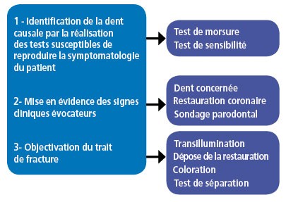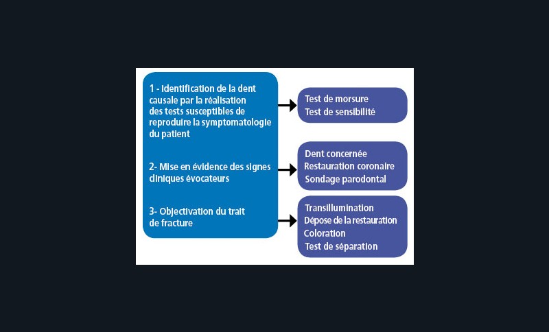 3. L’objectivation du trait de fracture : en ayant recours à différents tests cliniques (décrits en détail dans l’article) comme les tests de transillumination ou de séparation. La dépose de la restauration coronaire est nécessaire pour visualiser sans ambiguïté le trait de fracture.