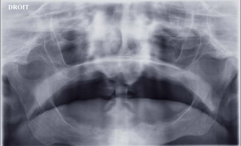 Un patient de 74 ans a été adressé dans le service de chirurgie maxillo-faciale du Centre Hospitalier Intercommunal de Villeneuve Saint-Georges pour le bilan d’une ostéolyse du maxillaire. Ses antécédents étaient un tabagisme évalué à 25 paquets/année, une consommation régulière d’alcool, une arythmie cardiaque par fibrillation auriculaire chronique, une bronchopneumopathie chronique obstructive tabagique et une hypertension artérielle, antécédents pour lesquels il était suivi et traité. Il était porteur de prothèses dentaires amovibles maxillaire et mandibulaire depuis plus de dix ans. Il n’avait aucun document relatif à son état bucco-dentaire antérieur aux avulsions dentaires. L’anamnèse ne retrouvait pas de notion d’épisode infectieux. Il n’y avait pas d’altération de l’état général.