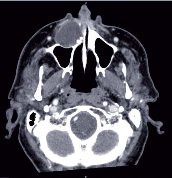 – un scanner du massif facial (fig. 2, 3, 4) a permis d’objectiver un processus expansif hypodense, maxillaire médian et paramédian droit, de 42 mm de grand axe, bien délimité par un liseré dense, aux parois propres, avec une…