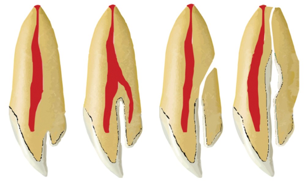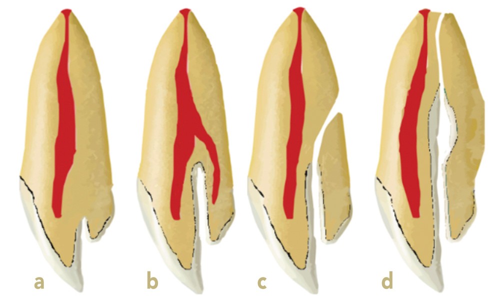 Différentes classifications ont été décrites pour représenter cette anomalie dont celle d’Oehlers basée sur la représentation radiologique (fig. 1) [1, 2]. Dans la majorité des situations cliniques, la détection d’une dens in dente est fortuite et la prise en charge conduit à la réalisation d’un traitement endodontique initial particulièrement complexe. En fonction du type rencontré, tant l’accès des irrigants endodontiques que l’étape d’obturation constituent un véritable challenge, ce qui influence fortement le taux de succès de la thérapeutique [3].
