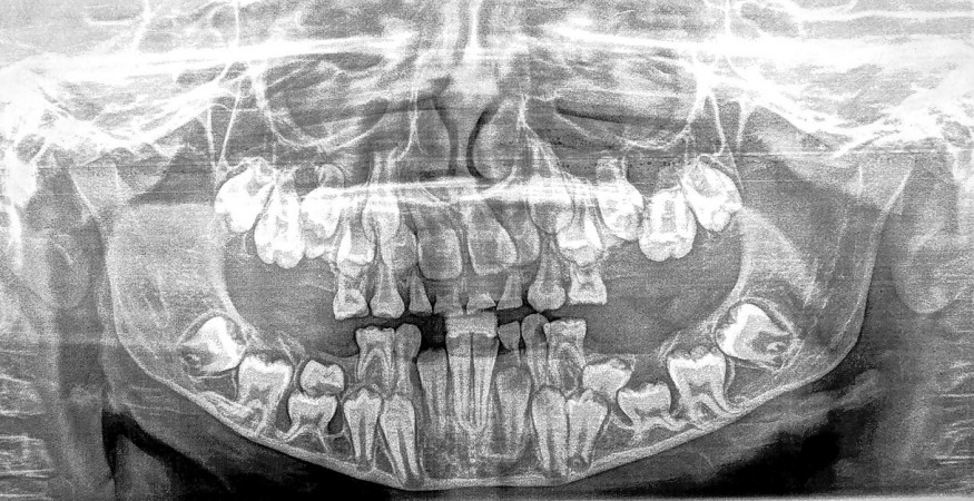 Ce cas est une forme sévère, puisque les quatre quadrants sont touchés ainsi que les dents profondément incluses, correspondant à une forme de DPE bilatérale et bimaxillaire (fig. 1).