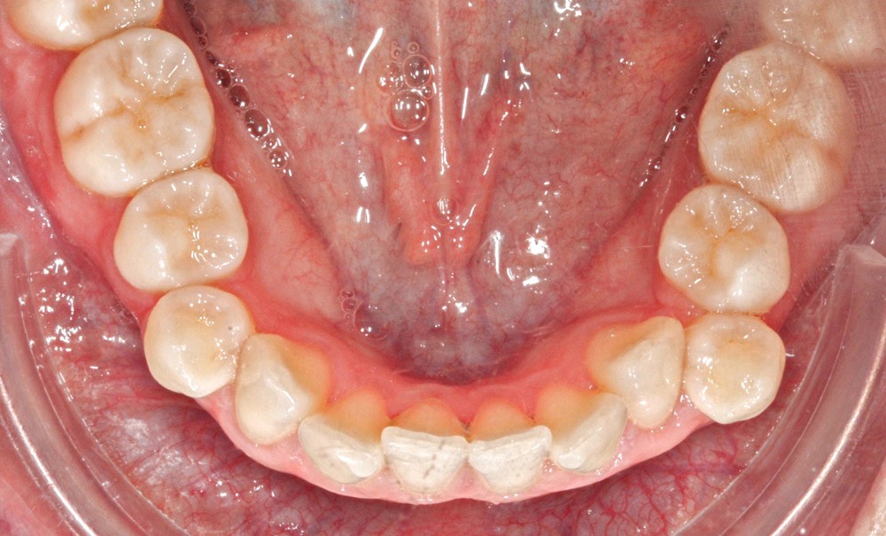 L’examen intra-arcade met en évidence une hygiène bucco-dentaire irréprochable, favorable à un traitement en technique linguale. Le phénotype parodontal est fin dans la région incisivo-canine mandibulaire. L’encombrement est estimé à 8 mm à la mandibule et à 4 mm au maxillaire (fig. 2). Les arcades ont des formes similaires, en U. Les rapports inter-arcades mettent en évidence une classe I d’Angle…