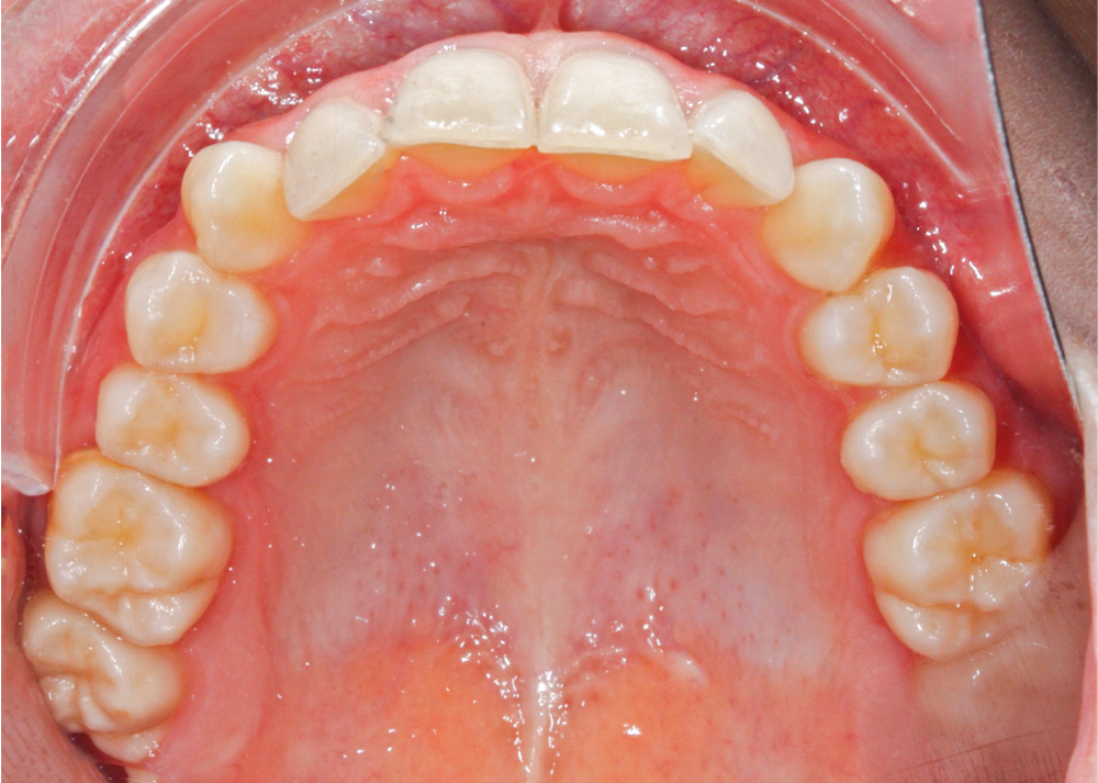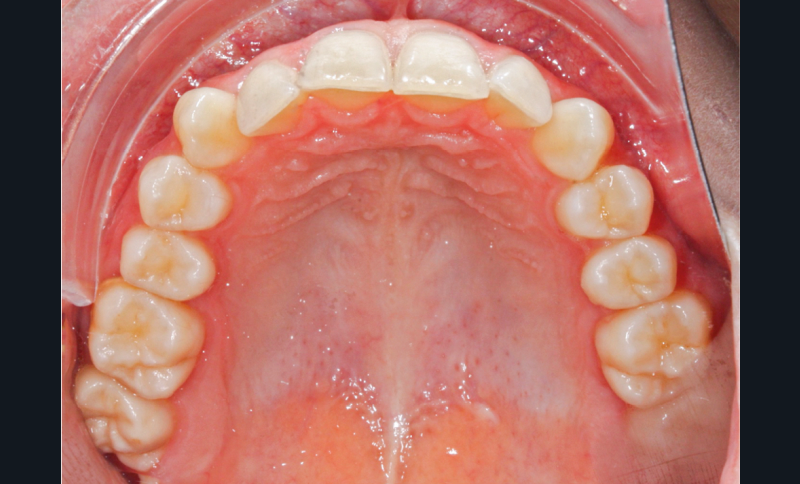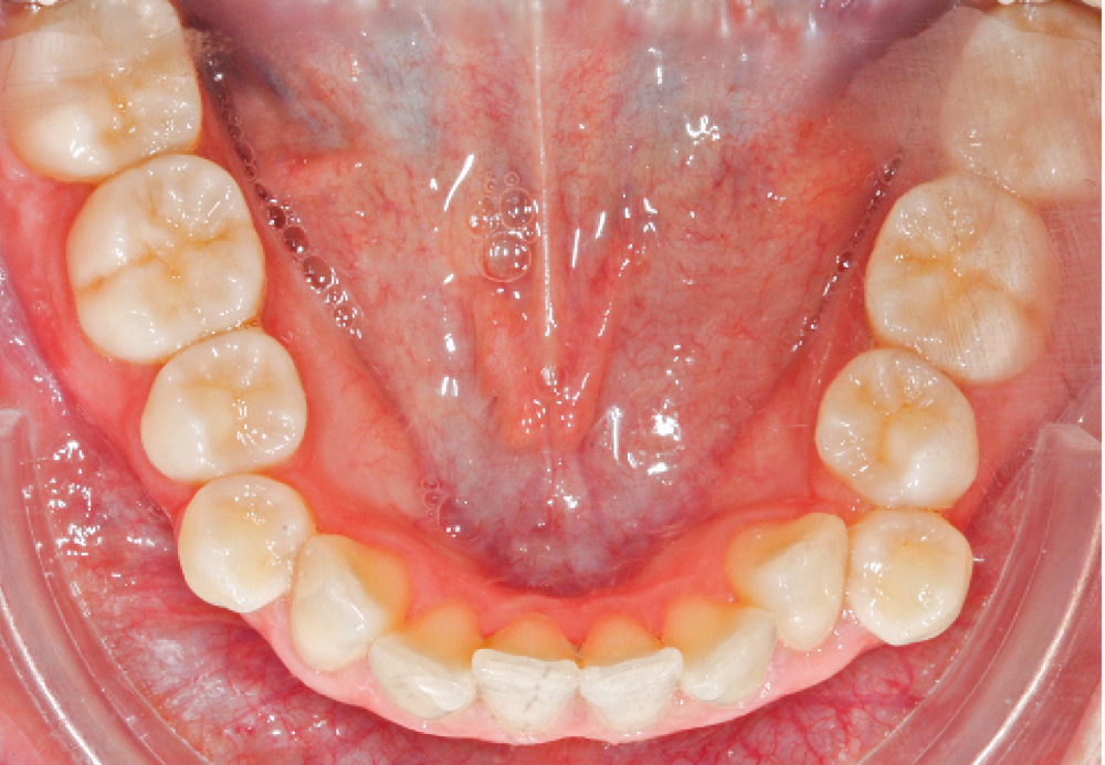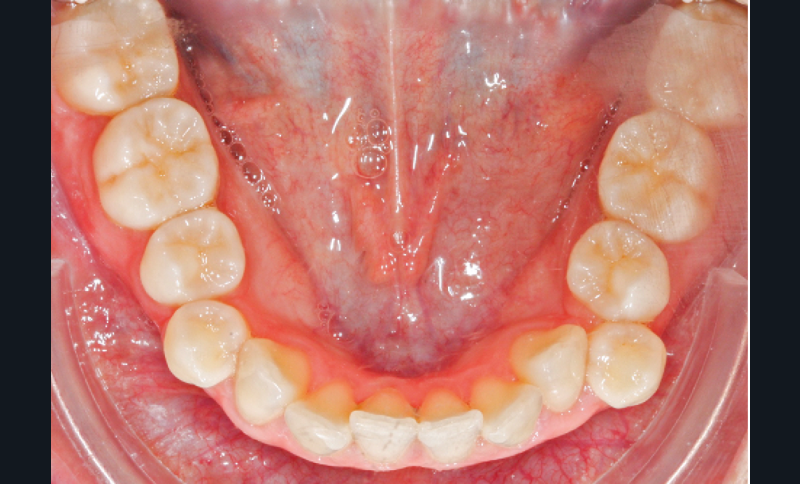 L’examen intra-arcade met en évidence une hygiène bucco-dentaire irréprochable, favorable à un traitement en technique linguale. Le phénotype parodontal est fin dans la région incisivo-canine mandibulaire. L’encombrement est estimé à 8 mm à la mandibule et à 4 mm au maxillaire (fig. 1). Les arcades ont des formes similaires, en U. Les rapports inter-arcades mettent en évidence une classe 1 d’Angle molaire, une classe 2 d’Angle canine et une supraclusion antérieure (recouvrement : 5 mm ; surplomb diminué). Les milieux inter-incisifs sont déviés entre eux avec une origine mixte (= 1,5 mm) (fig. 2).