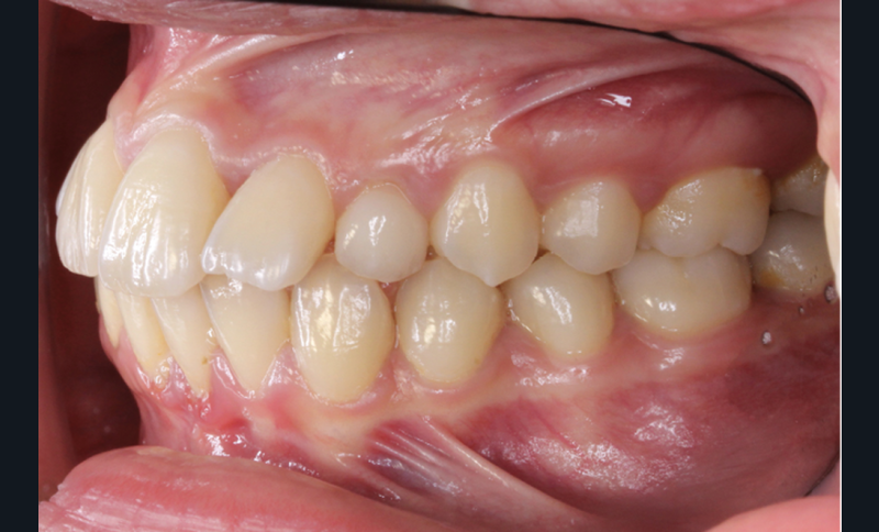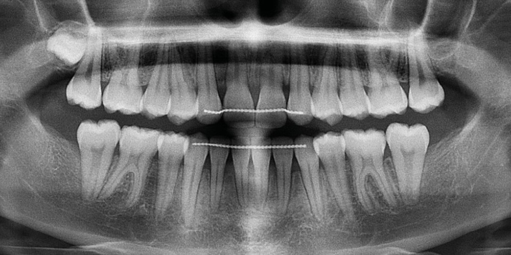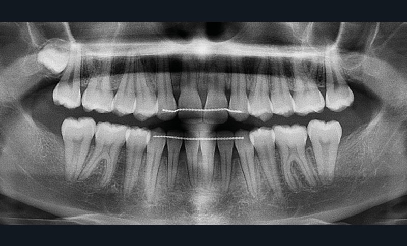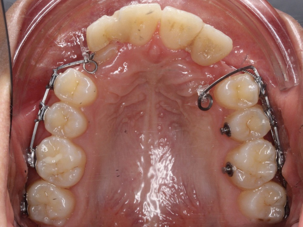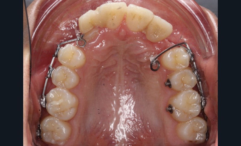 Un appareil multi-attaches .022 x .028 (prescription de Roth) est posé sur toute l’arcade mandibulaire et sur les secteurs postérieurs maxillaires (17 à 14 et 27 à 24) afin d’éviter au maximum la sollicitation de 11 et 21 et donc de limiter les résorptions radiculaires.