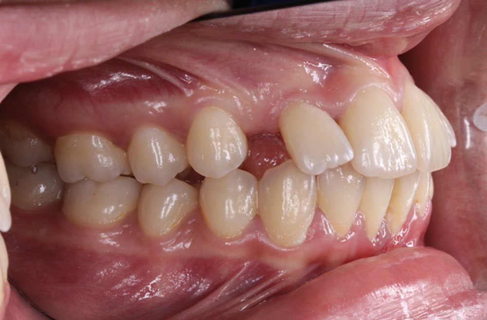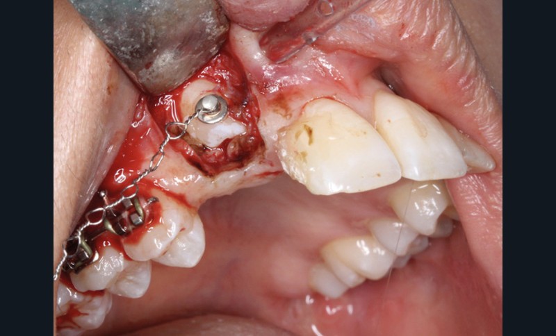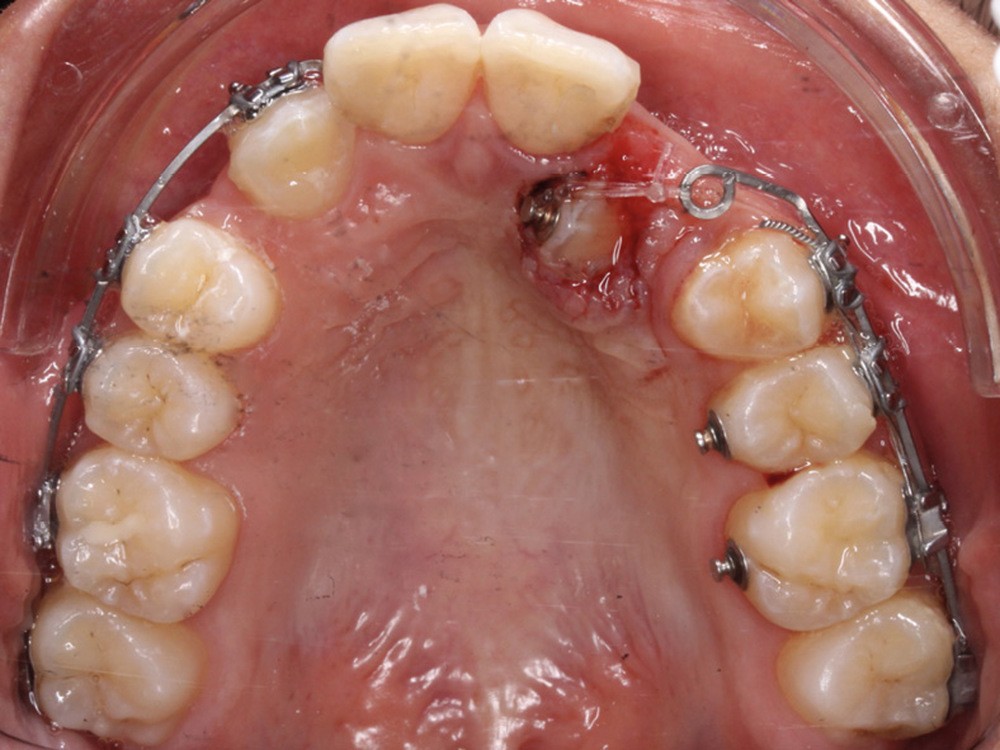 La désinclusion des canines a été réalisée dans un deuxième temps opératoire après trois semaines de cicatrisation muqueuse afin d’avoir une quantité de gencive attachée suffisante lors de la réalisation des lambeaux. Un lambeau déplacé apicalement a été réalisé pour désinclure la 13, avec une direction de traction distale sur une potence soudée sur le sectionnel activée après trois semaines de cicatrisation (fig. 3). Un lambeau muco-périosté repositionné a été réalisé pour désinclure la 23 qui a été immédiatement mise en charge par traction distale sur un bouton palatin collé sur 25. Un approfondissement vestibulaire mandibulaire antérieur a ensuite été réalisé.