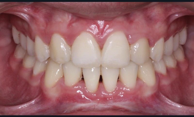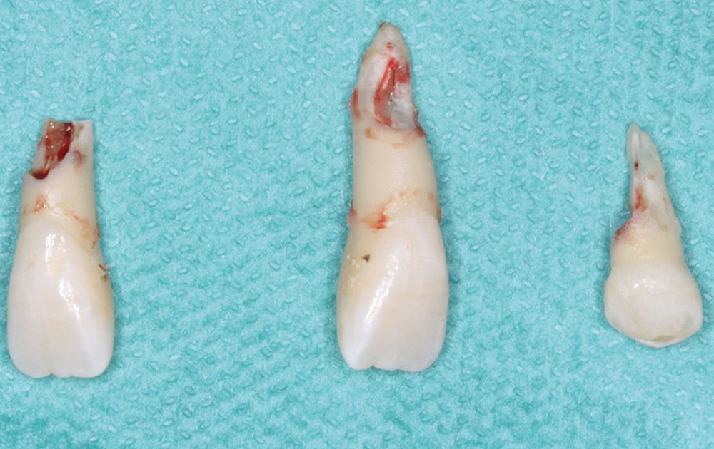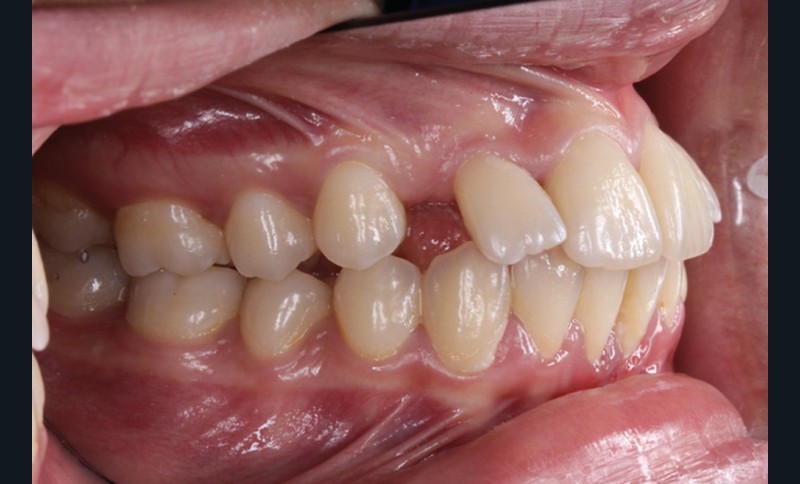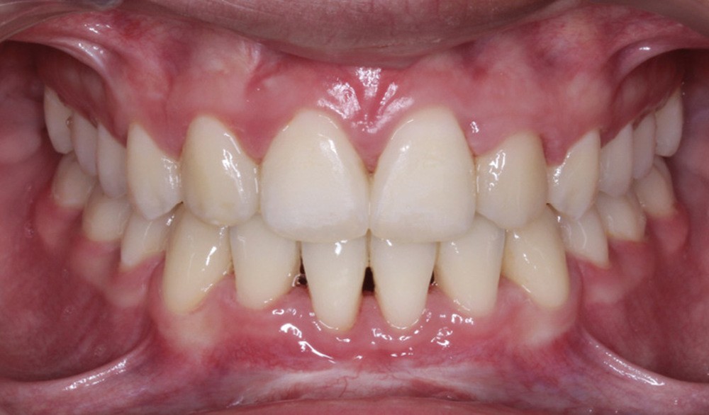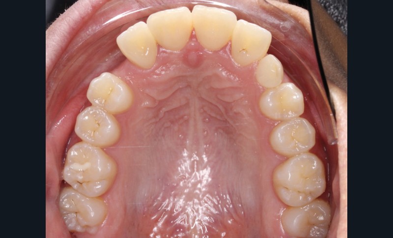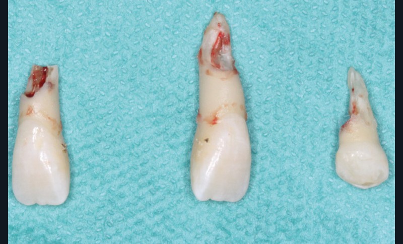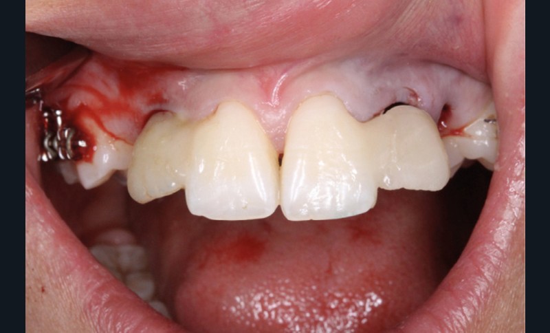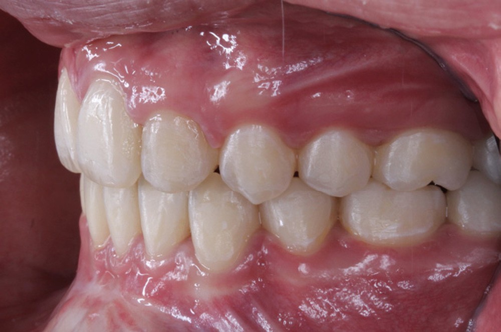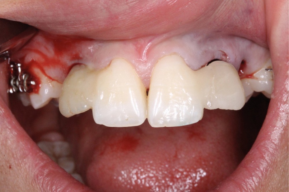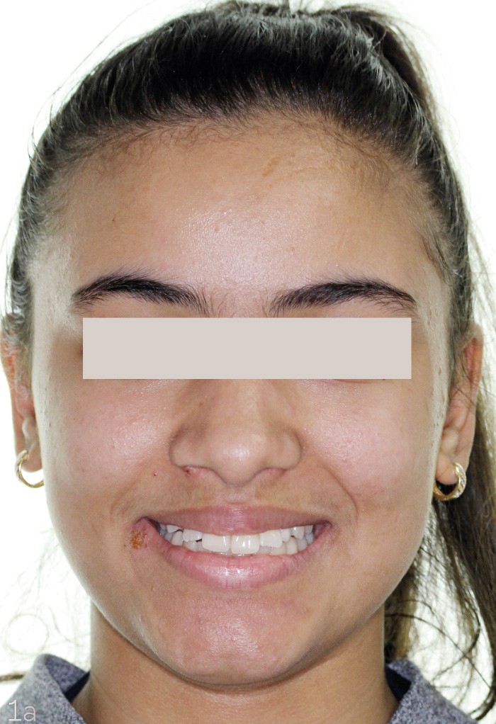 Les extractions de 12, 22, 63, 34 et 44 ont été réalisées dans un premier temps. Un cache esthétique en résine composite a été élaboré à partir d’une clé en silicone obtenue sur les empreintes initiales et collé sur 11 et 21 afin de limiter l’impact psychologique de telles extractions (fig. 2a-b).