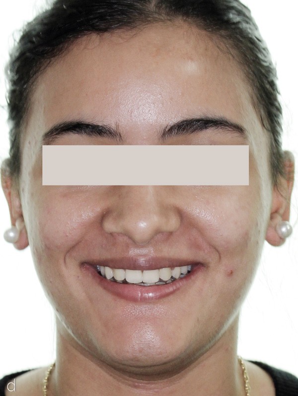 Les caches esthétiques ont été progressivement diminués jusqu’à leur suppression complète. Une fois l’alignement des canines obtenu, la prise en charge de 11 et 21 sur un NiTi .014 a débuté. Des forces très douces avec un contrôle radiologique tous les trois mois ont ensuite permis l’alignement et la fermeture des derniers espaces maxillaires. Une coronoplastie soustractive de 13 et 23 a été réalisée pour les transformer en 12 et 22. La vitalité de 11 et 21 a été conservée. En contention, deux fils collés ont été mis en place (13-23 et 33-43) ainsi qu’une gouttière thermoformée maxillaire amovible à port nocturne. Le traitement a duré vingt-neuf mois (fig. 5a-f).