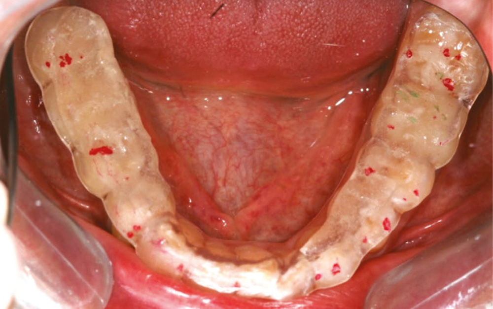 De plus, nous proposons d’y inclure également les patients déjà réhabilités par une prothèse amovible partielle. En effet, quelle que soit la qualité de la prothèse, il est fréquent d’observer une perte de hauteur prothétique liée à l’usure et/ou à l’enfoncement, ce qui provoque une perturbation de la courbe de Spee et une compression articulaire.