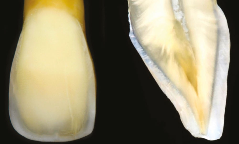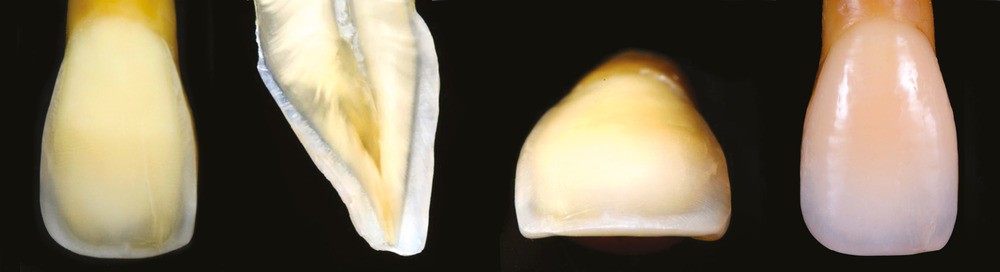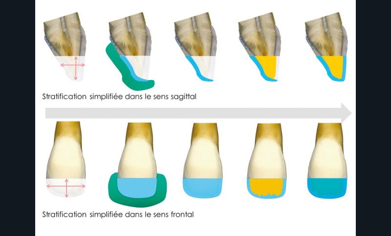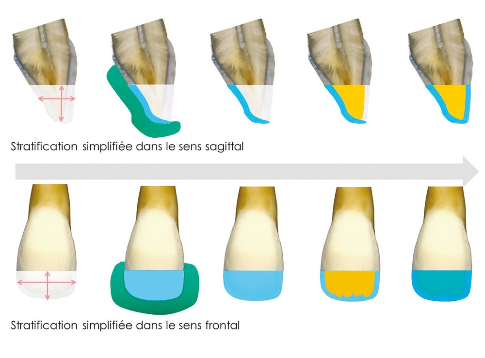 Si de nombreuses techniques de stratification antérieure des résines composites ont été décrites ces trois dernières décennies, la méthode la plus communément employée actuellement est la stratification anatomique dite naturelle [1-3,11-14]. Elle suit l’agencement histo-anatomique des tissus à remplacer : une masse de composite émail recouvrant une ou plusieurs masses de composite dentine selon la complexité de la situation (fig. 2).