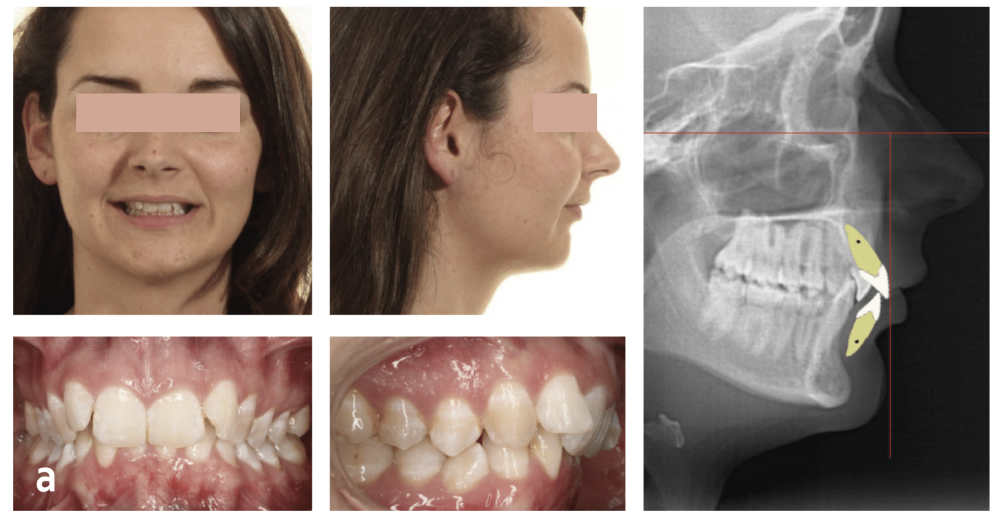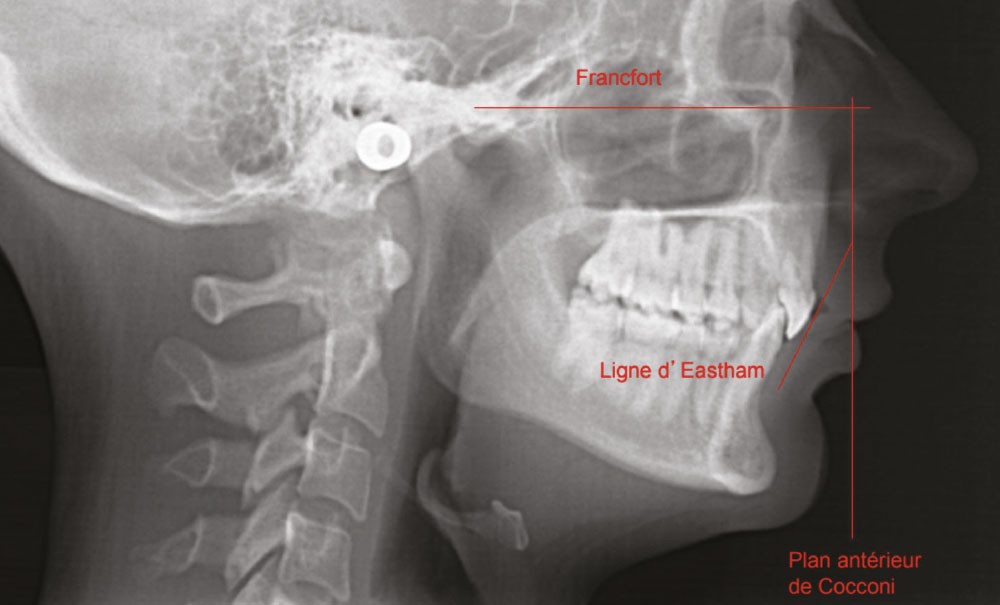 La céphalométrie aide au diagnostic. De manière simplifiée, sur une téléradiographie de profil, le plan de Francfort puis le plan antérieur de Cocconi, qui passe par le point le plus antérieur de l’os maxillaire, sont tracés ; la ligne qui passe par la face vestibulaire de l’incisive centrale maxillaire doit être tangente à ce plan (fig. 1). L’incisive centrale mandibulaire doit être au contact de son antagoniste. Si, à la suite de la simulation de cette analyse, l’incisive du bas est en dehors de l’enveloppe osseuse, cela implique le choix thérapeutique d’une chirurgie orthognatique du maxillaire et/ou de la mandibule (fig. 2).