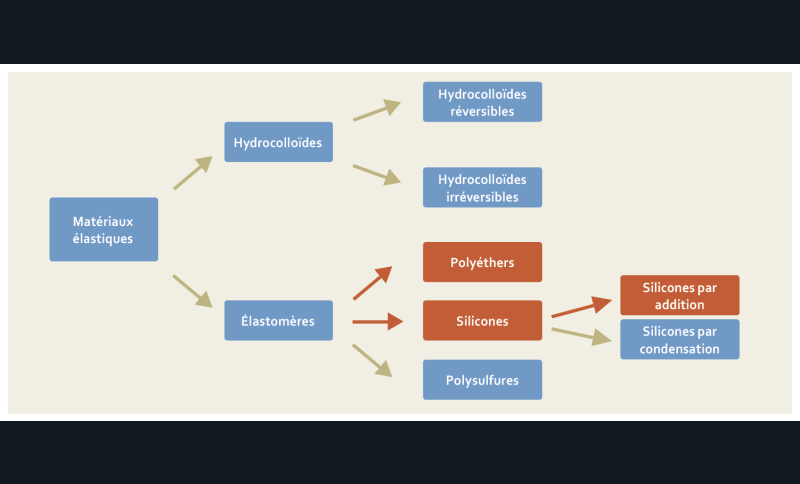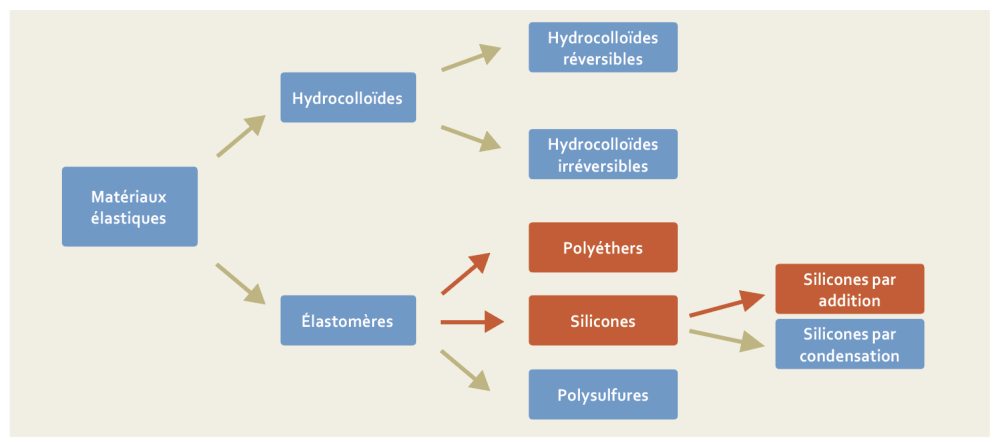 Selon la classification d’O’Brien [2], il existe deux grandes familles de matériaux élastiques : les hydrocolloïdes et les élastomères (fig. 1).