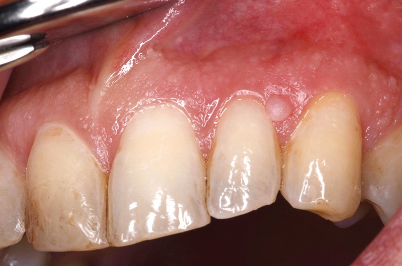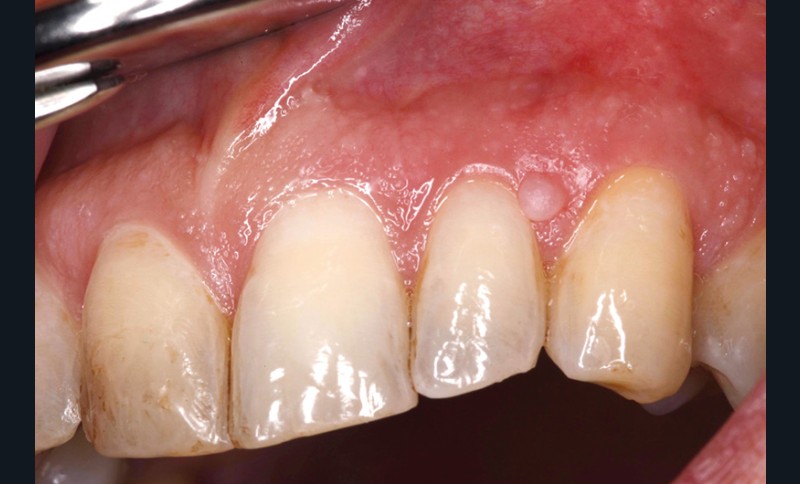 Examen clinique. La muqueuse buccale avait un aspect légèrement érythémateux, plus particulièrement celle du voile et du plancher buccal antérieur. Il n’y avait pas de mélanose tabagique, mais on observait la présence de pigment liée au tabagisme sur les dents. La lésion était constituée par un nodule ferme, de couleur rose pâle, pseudo-pédiculé, de 2 mm de diamètre, dont la base d’implantation n’était pas située directement sur le bord libre de la gencive.