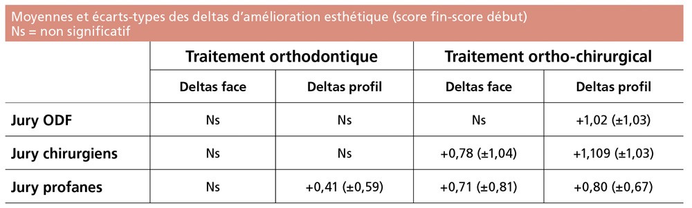Les photographies de face et de profil, avant et après traitement, des patients en classe III, et les photographies après traitement des patients de référence ont été présentées de manière aléatoire, via un questionnaire en ligne, aux trois jurys. Ceux-ci ont été invités à évaluer les photographies par le biais d’une échelle visuelle analogique non graduée. Nous avons ainsi obtenu trois scores esthétiques moyens (compris entre 0 et 10) pour chaque photographie de patient. Une analyse statistique des données a été réalisée ; le seuil de significativité a été fixé à 5 %.