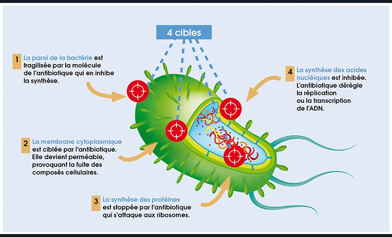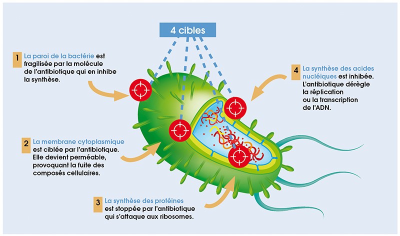 Il existe quatre familles d’antibiotiques, chacune d’elles présentant un mécanisme d’action en fonction de la partie de la bactérie ciblée (fig. 1).