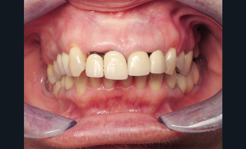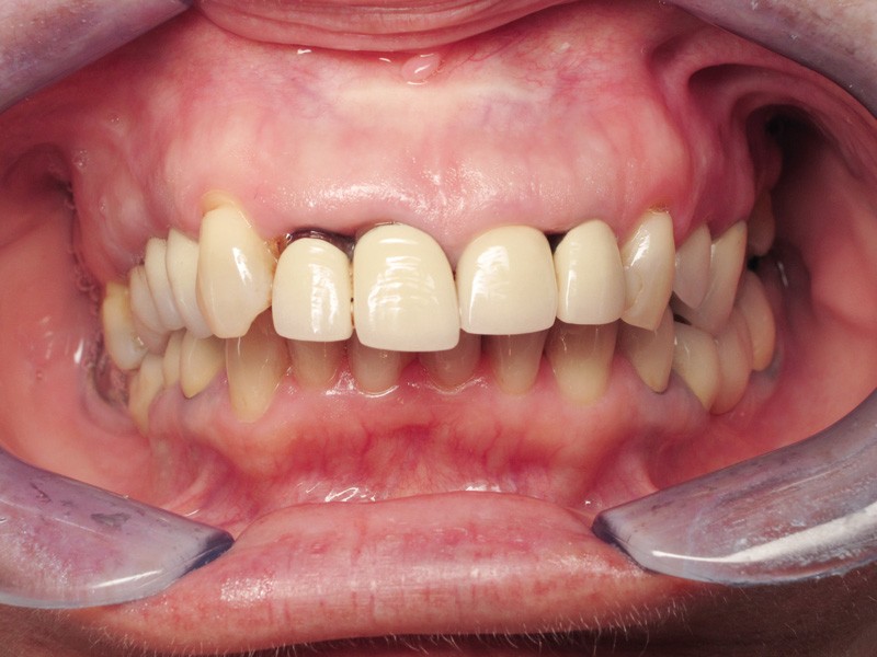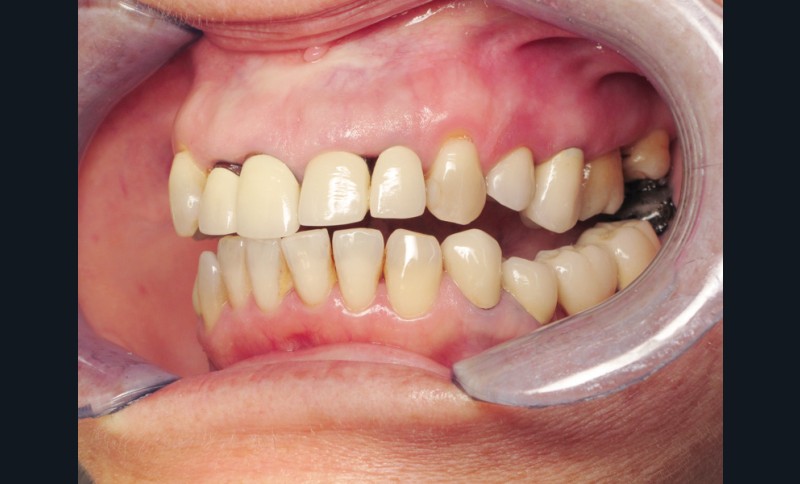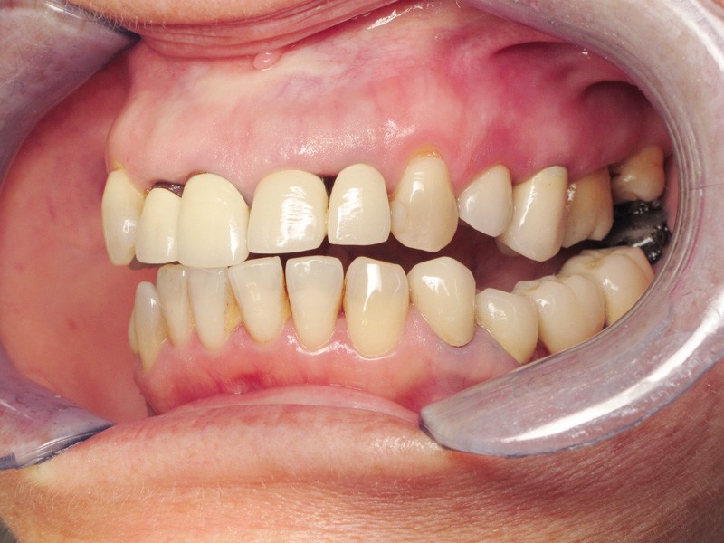 Madame J., âgée de 63 ans, consulte pour des douleurs chroniques localisées au niveau de 14 et de 21. L’examen endobuccal révèle la présence de prothèses anciennes, de soins conservateurs et d’un implant posé depuis 4 ans. On note une inflammation généralisée du parodonte superficiel avec présence de plaque et de tartre et une mobilité de certaines dents dont les incisives maxillaires droites. Dès ce stade, le surguidage antérieur du couple 11/12, reconstitué par des couronnes solidarisées, est à mettre en relation avec la souffrance parodontale observée (fig. 1).