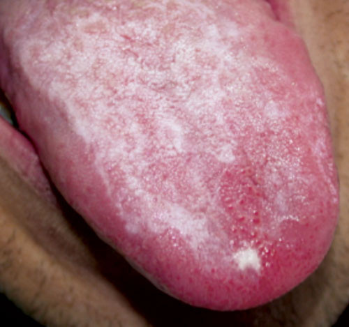 L’examen clinique révèle un aspect blanchâtre de la face dorsale de la langue (fig. 1). Ces lésions blanches correspondent à un élargissement des papilles filiformes qui sont devenues jointives. L’hyperkératinisation forme un réseau et une plaque homogène sur la partie antérieure de la langue. L’examen des joues droite et gauche montre un réseau kératosique avec un discret érythème en nappe. Aucun examen paraclinique n’est réalisé.