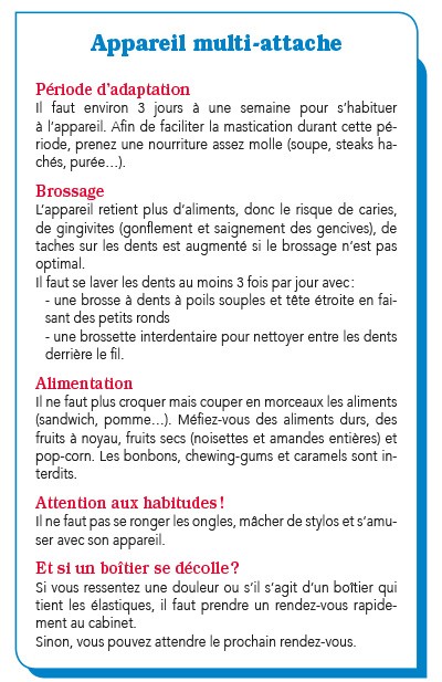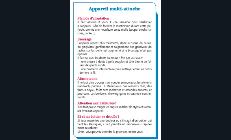 • La période d’adaptation : indiquer la durée de cette période, ainsi que les précautions en termes d’alimentation pendant les premiers jours (aliments mous) et les moyens pour se soulager (cire orthodontique) sachant que le praticien a généralement fourni une ordonnance d’antalgique.