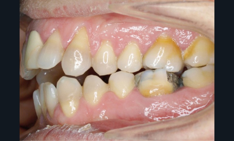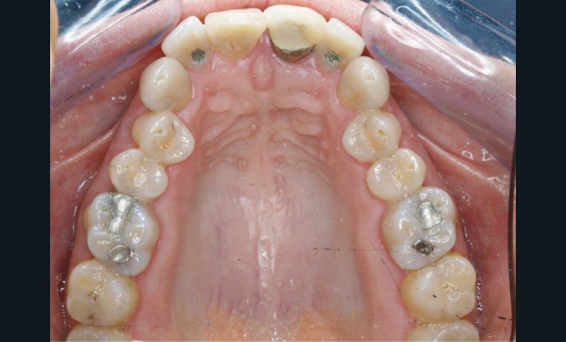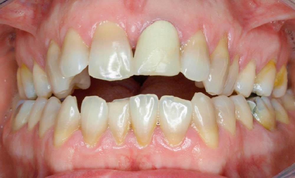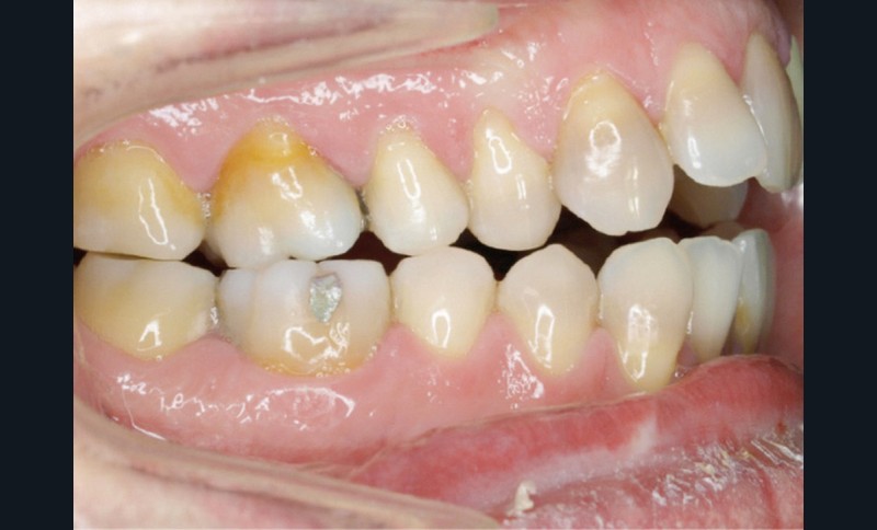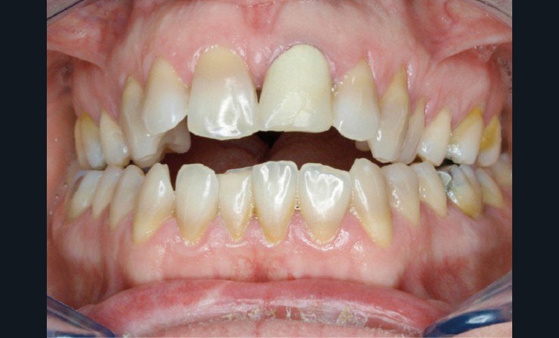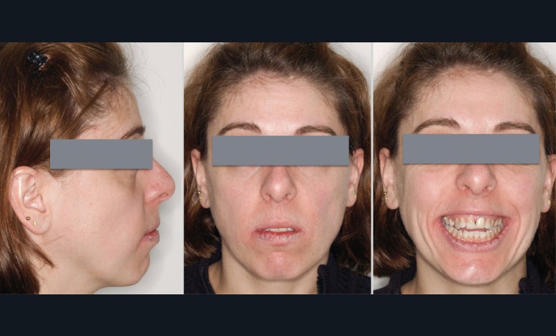 En 2008, la patiente, âgée de 34 ans, se présente pour le traitement de ses « dents mal placées, et de l’écart entre les dents du haut et du bas » (fig. 1). Elle a déjà bénéficié d’un traitement adolescent par plaque amovible maxillaire.