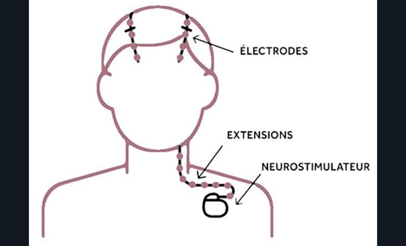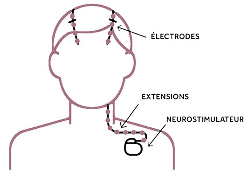 Implantation d’électrodes dans les noyaux gris centraux et d’un stimulateur électrique au niveau pectoral.