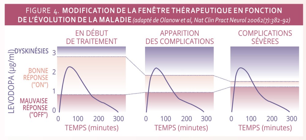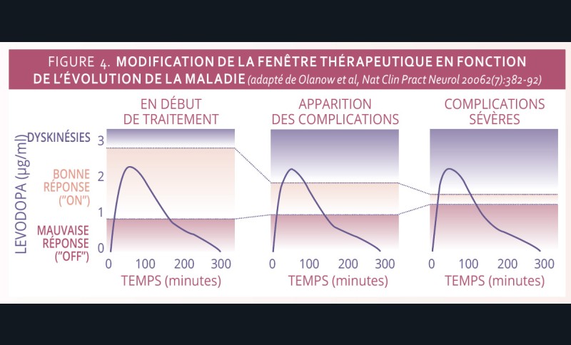 La fenêtre thérapeutique (bande rose) est large en début de maladie et les variations du niveau de Levodopa ont peu d’impact sur l’état moteur du patient. Mais plus la maladie progresse, plus la fenêtre thérapeutique se réduit (fig. 4). Une bonne réponse est donc plus difficile à obtenir.