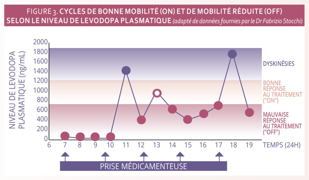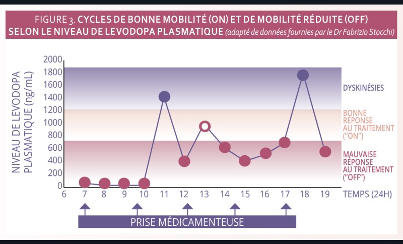 La symptomatologie motrice fluctue au cours de la journée selon la concentration de Levodopa plasmatique. Elle alterne entre des cycles de bonne mobilité (on) et de mobilité réduite (off). Lorsque le niveau de Levodopa est trop bas, le patient présente des blocages et, à l’inverse, lorsqu’il est trop élevé, des mouvements incontrôlés (dyskinésies) apparaissent (fig. 3).