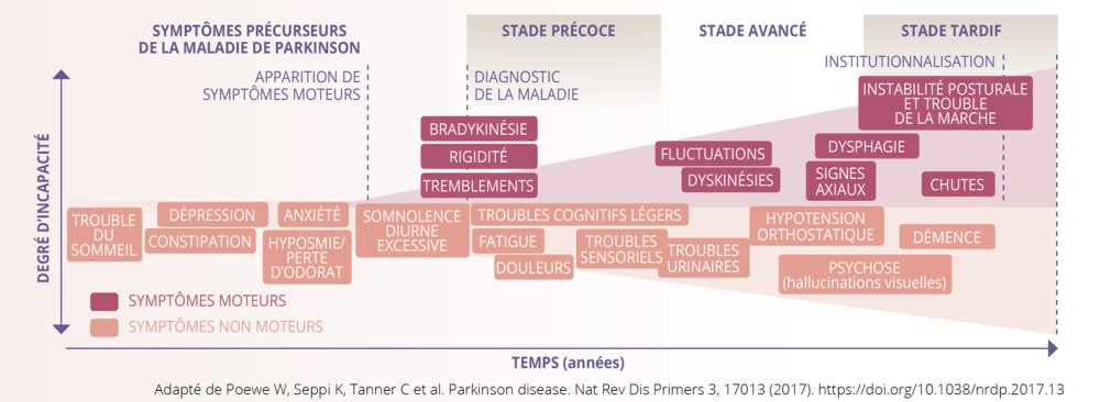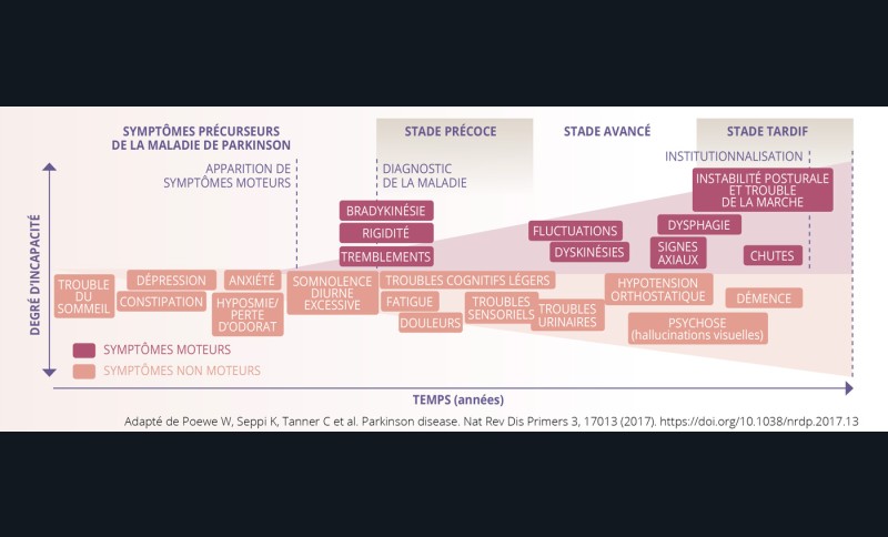 La maladie de Parkinson évolue schématiquement en quatre phases à durée variable.