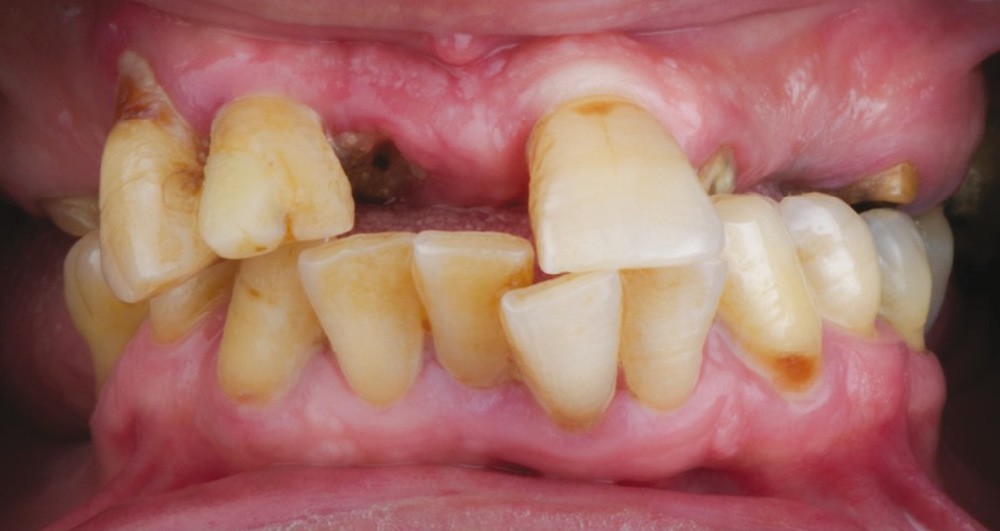 À l’examen endobuccal, le sondage parodontal révèle une parodontite généralisée stade 4 grade A [1] caractérisée par des pertes d’attaches ≥ 5 mm, une alvéolyse au niveau radiographique > 50 % de la hauteur radiculaire, des pertes dentaires en raison de la maladie parodontale et des migrations secondaires dentaires.