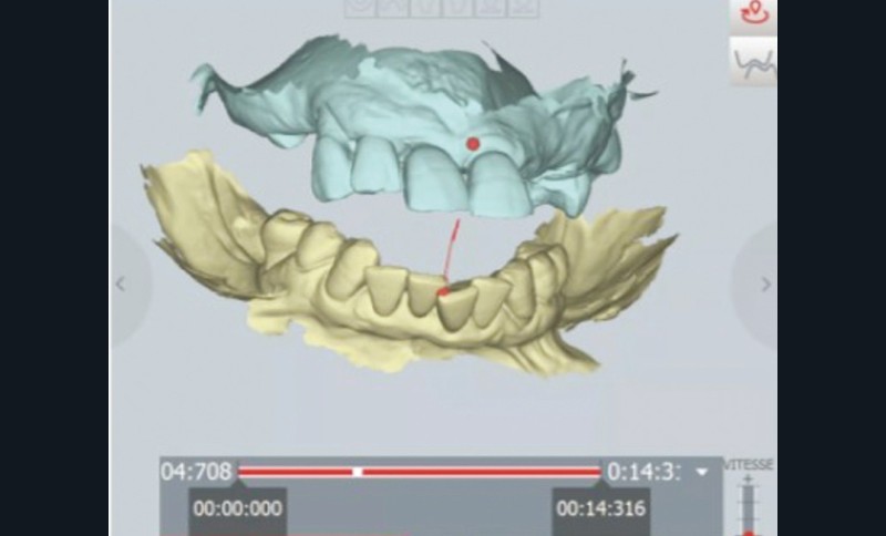 À partir de la position planifiée du plan d’occlusion, les futurs rapports intermaxillaires sont ensuite choisis à la fois cliniquement et à l’aide de l’enregistrement issu du modjaw : afin d’obtenir un équilibre des étages de la face après validation clinique, il est décidé d’augmenter la DVO de 5 mm en prenant comme référence l’enregistrement de la relation centrée, correspondant à une rotation pure des condyles selon l’axe charnière. Une maquette est alors réalisée afin de valider cliniquement l’augmentation envisagée.