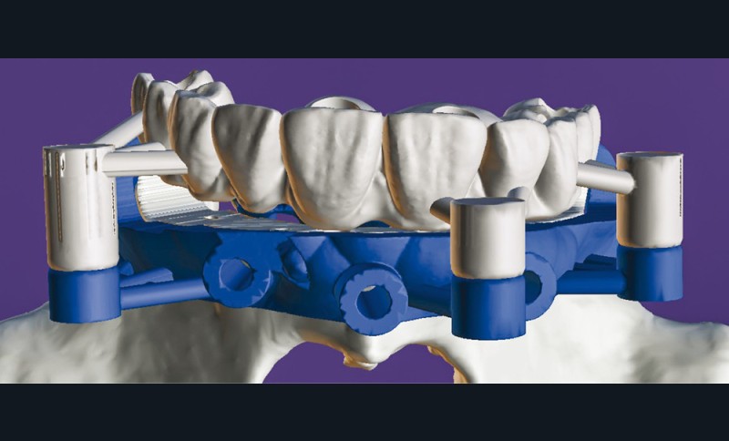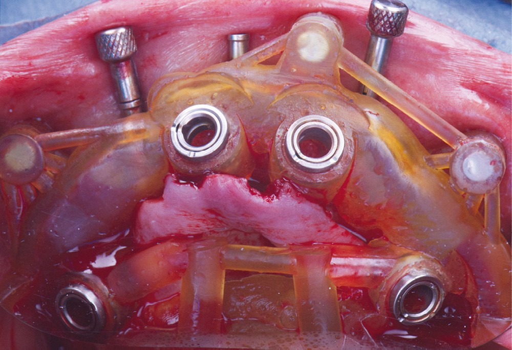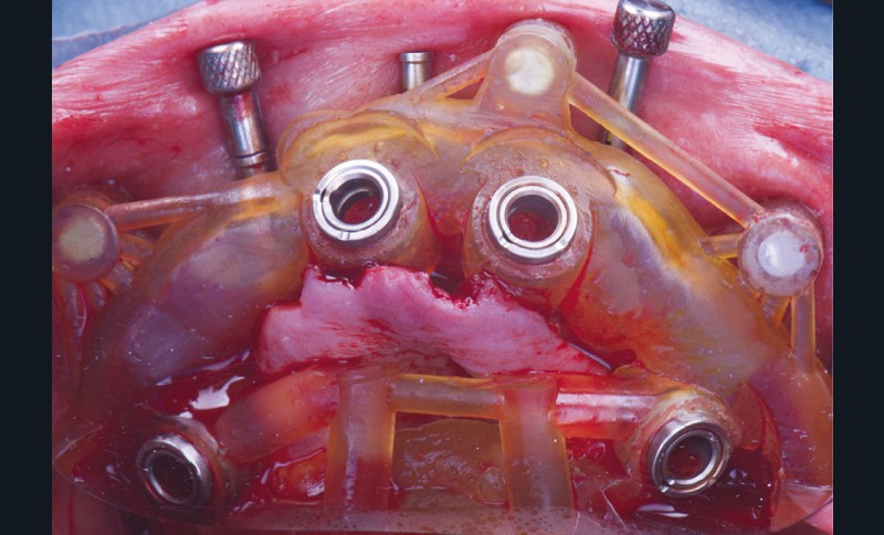 Pour optimiser la précision chirurgico-prothétique, et faciliter les étapes de traitement, un guide à appuis osseux avec plusieurs étages est conçu : le premier étage constitue la base, à ancrage osseux sur lequel les différents éléments du guide, ainsi que la prothèse pourront reposer précisément (fig. 5).