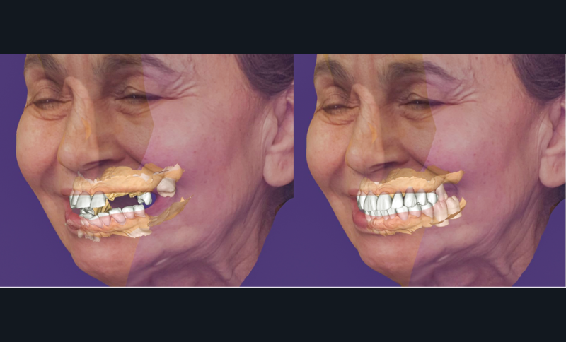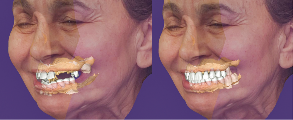 Afin de proposer un projet prothétique esthétique idéal pour la patiente, une simulation du sourire est réalisée à l’aide du logiciel Smilecloud en se basant sur le bilan photographique : celui-ci établira l’esthétique idéale en 2D du sourire sans tenir compte des contraintes chirurgicales et anatomiques. Ce projet en deux dimensions servira de modèle pour établir un projet prothétique maxillaire 3D qui permettra de positionner, virtuellement puis cliniquement, le futur plan d’occlusion.
