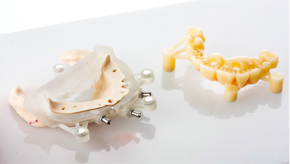 Afin de s’assurer un maximum de concordance entre la planification et la mise en place des implants, des guides chirurgicaux de résection osseuse, de forage et de positionnement des implants sont réalisés ainsi qu’une prothèse provisoire totalement usinée dans un disque Zirkonzahn résine premium, choisi pour sa rigidité et évidée en regard des futurs implants. Le choix de la conception du guide chirurgical est imposé par la nécessité de résection osseuse.