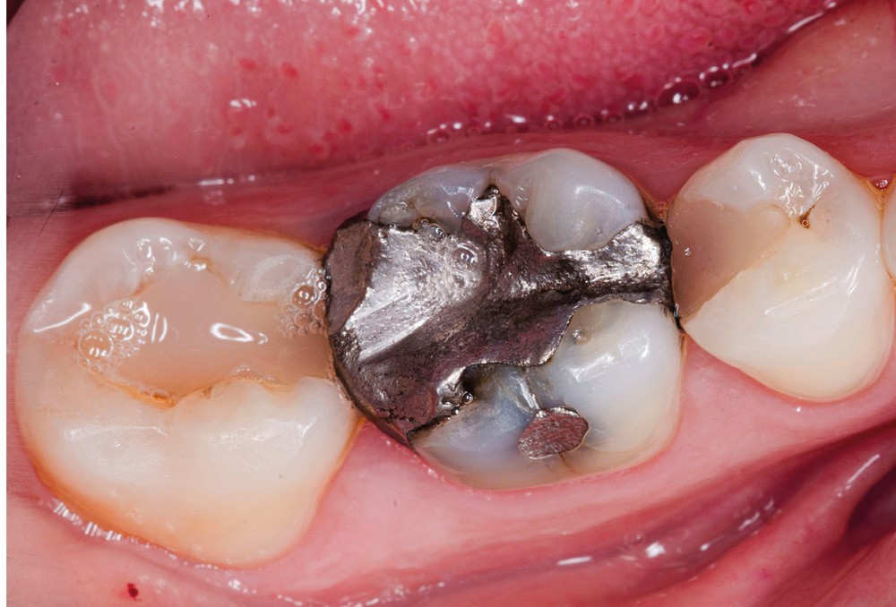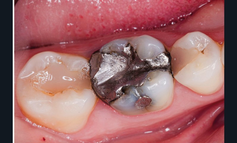 A l’examen clinique, nous observons une restauration à l’amalgame sur 46 non étanche ainsi que des restaurations composites sur 45 et 47 dont les morphologies sont usées (fig. 1). Après réalisation des tests cliniques, nous confirmons que la 46 est à l’origine de la sensibilité décrite par la patiente.