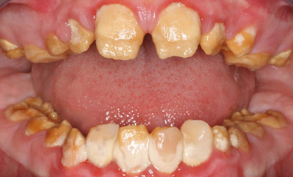 Les principales conséquences sont une usure dentaire rapide et une altération de l’esthétique perturbant la qualité de vie des patients atteints. D’autres caractéristiques cliniques sont fréquentes telles que des retards d’éruption, des agénésies, des calcifications pulpaires, une résorption progressive, des racines courtes ou très longues [6,7].
