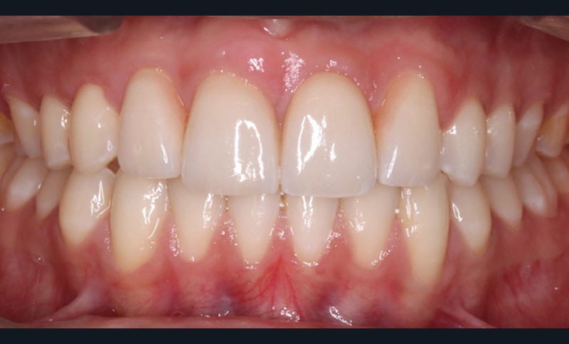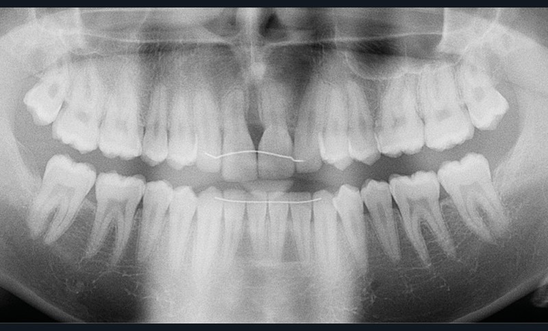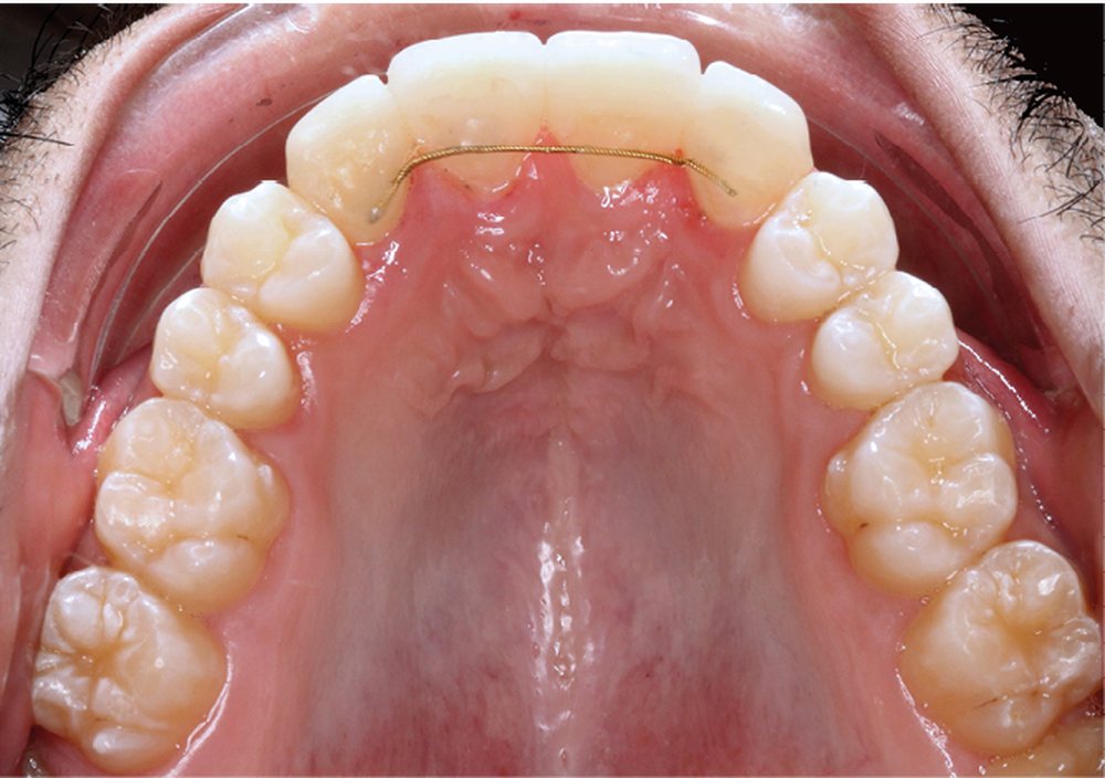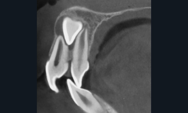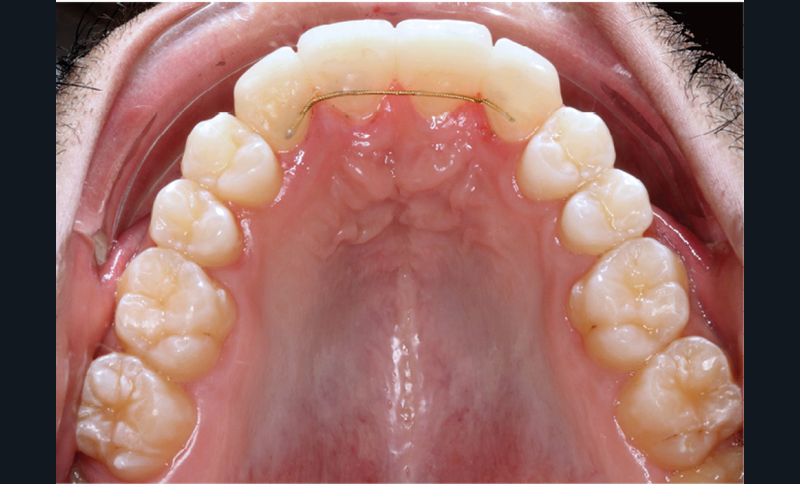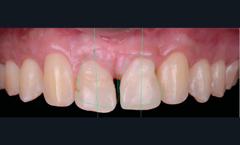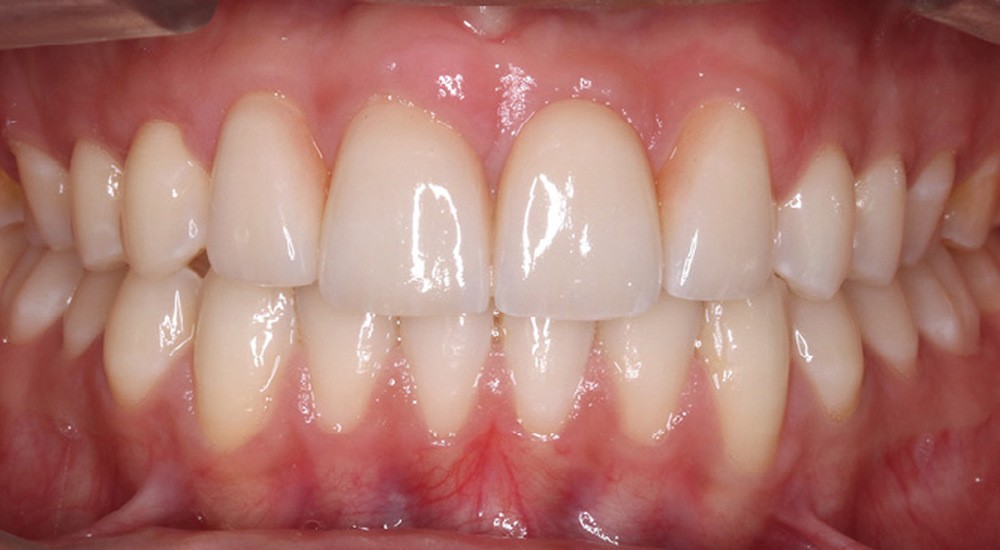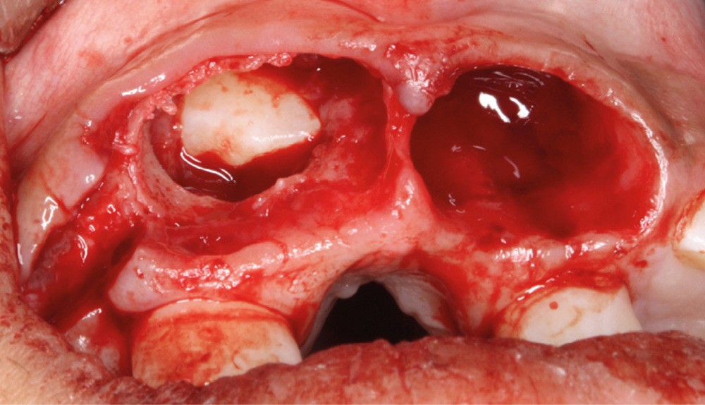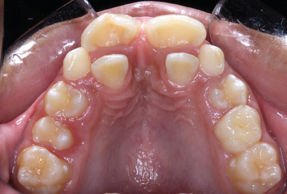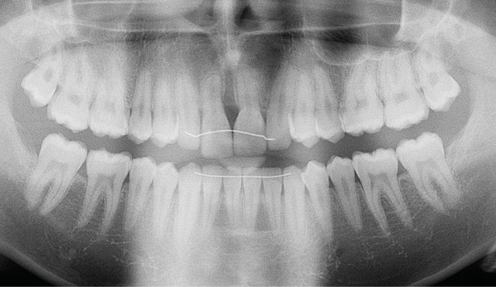 L’aspect inesthétique des incisives maxillaires (avec une impossibilité de réduction amélaire suffisante du fait des diamètres mésio-distaux radiculaires augmentés) et le pronostic réservé de la 11 (résorption radiculaire marquée) conduisent à la décision d’extraire les deux incisives centrales [1].