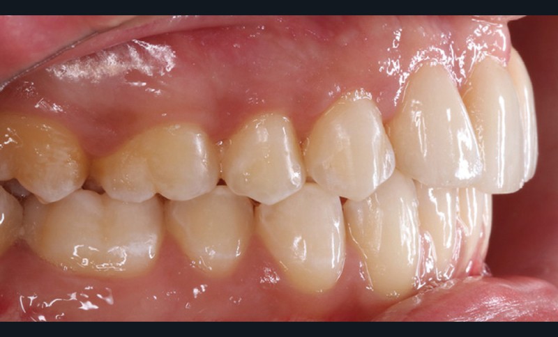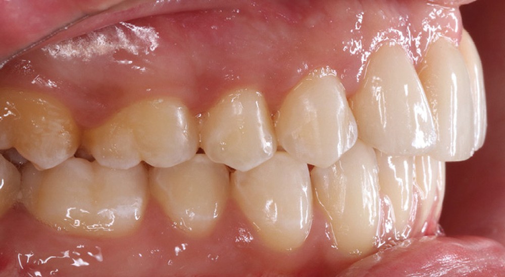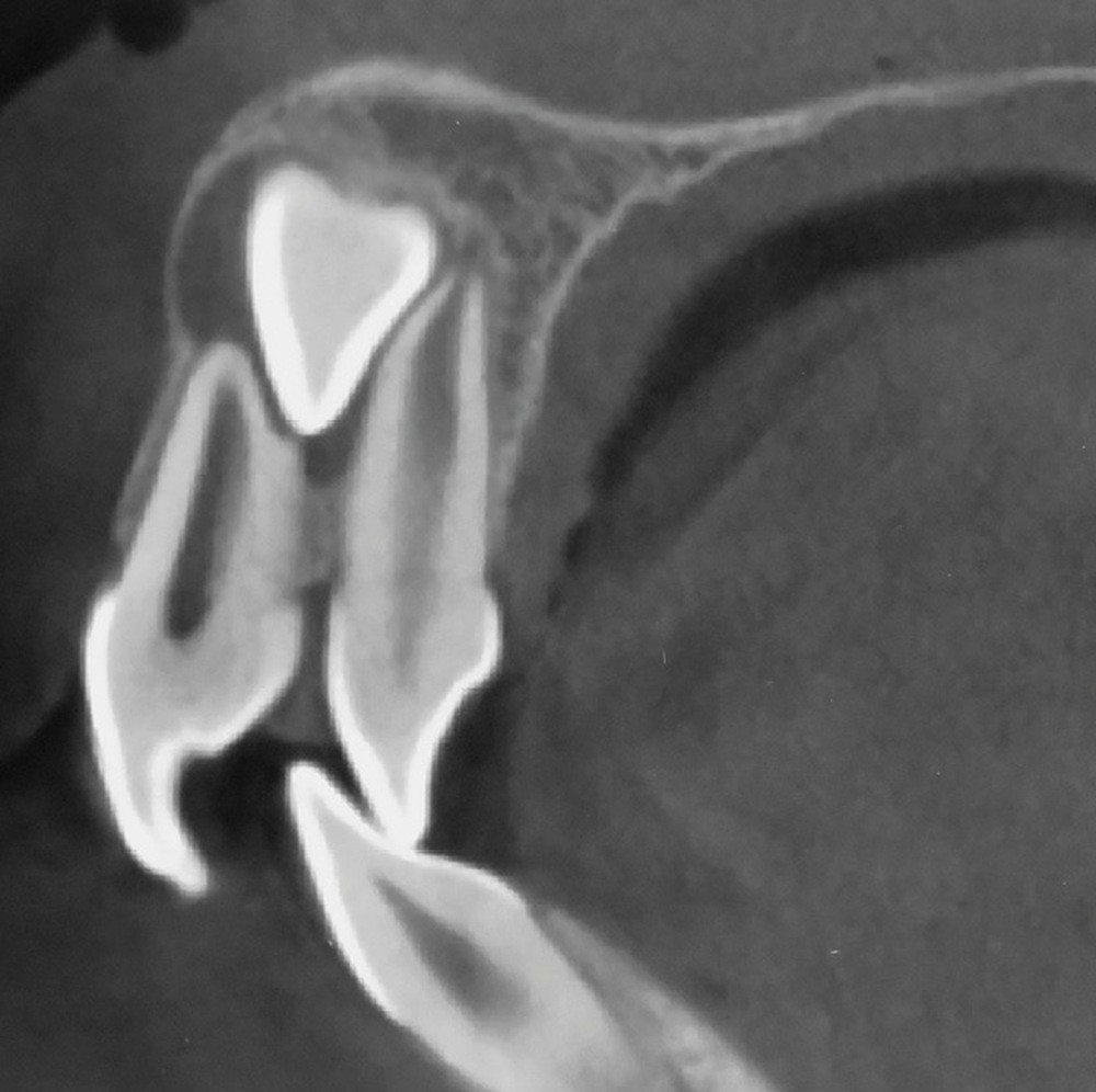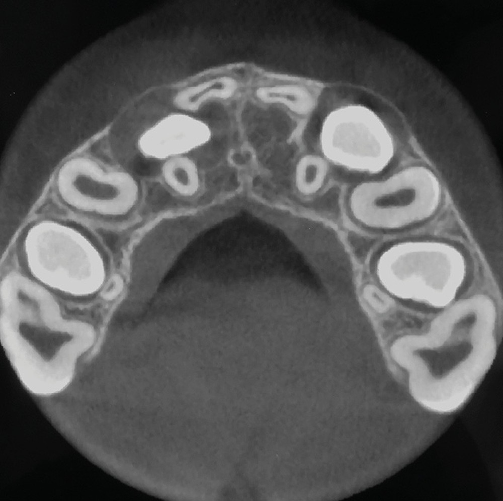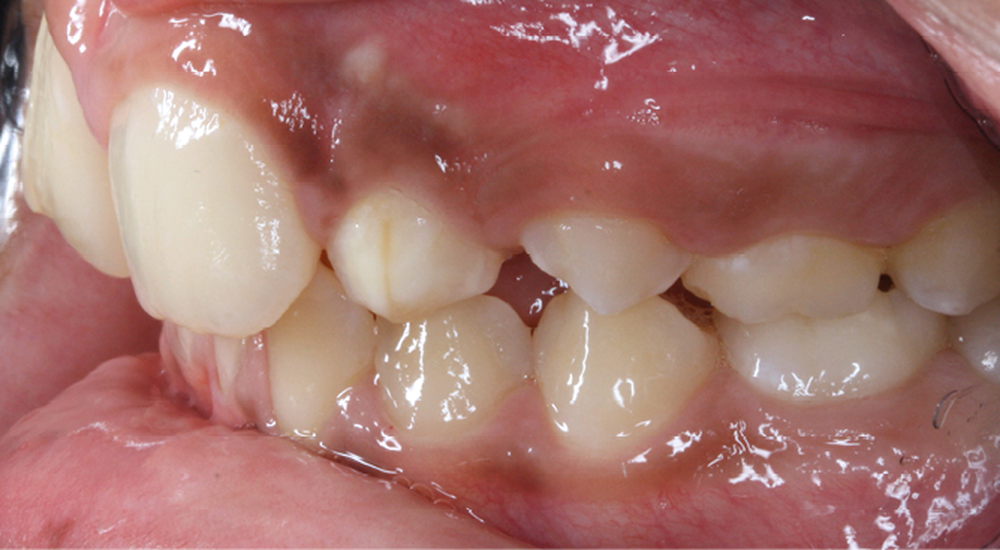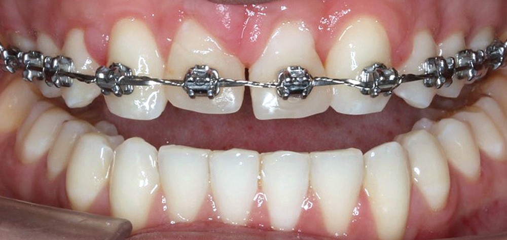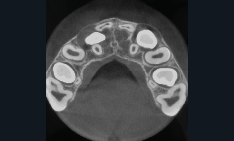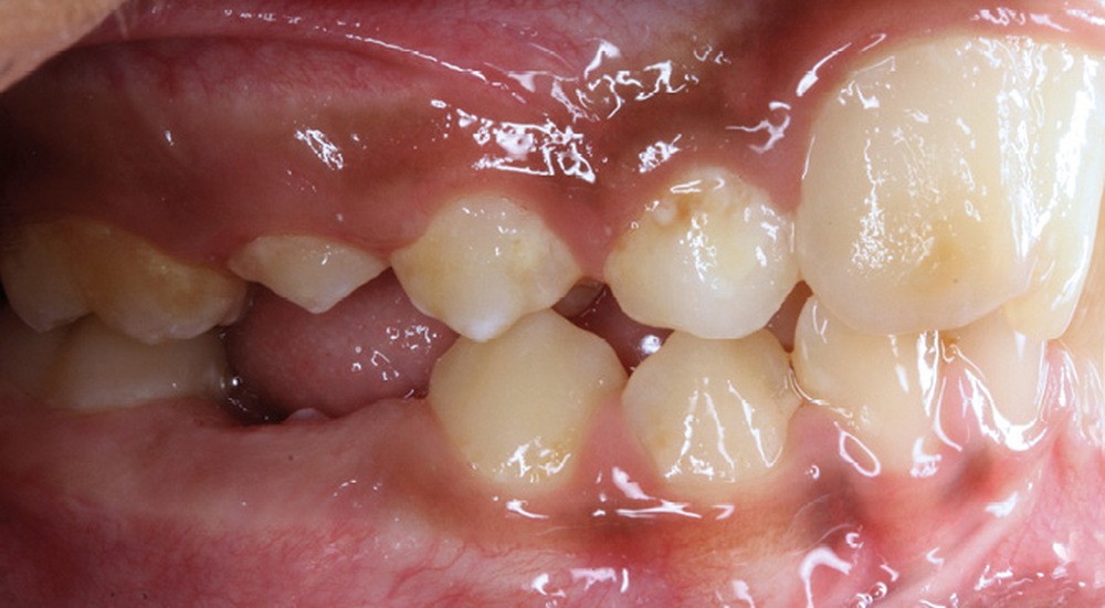 L’aspect inesthétique des incisives maxillaires (avec une impossibilité de réduction amélaire suffisante du fait des diamètres mésio-distaux radiculaires augmentés) et le pronostic réservé de la 11 (résorption radiculaire marquée) conduisent à la décision d’extraire les deux incisives centrales [1].