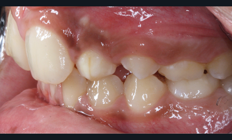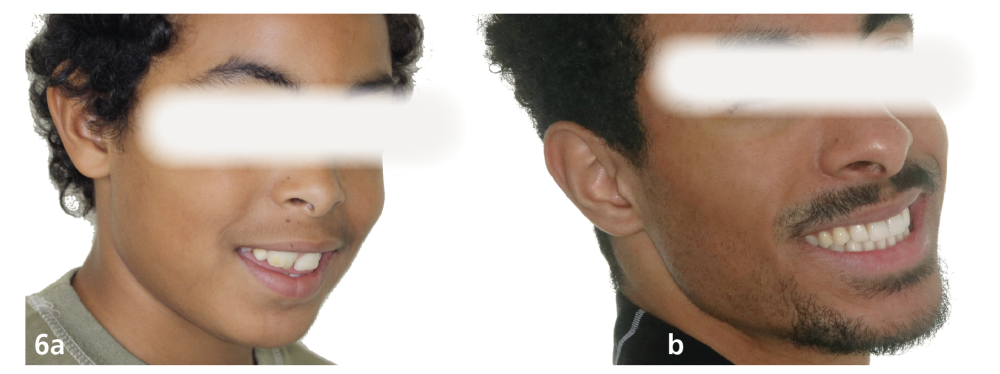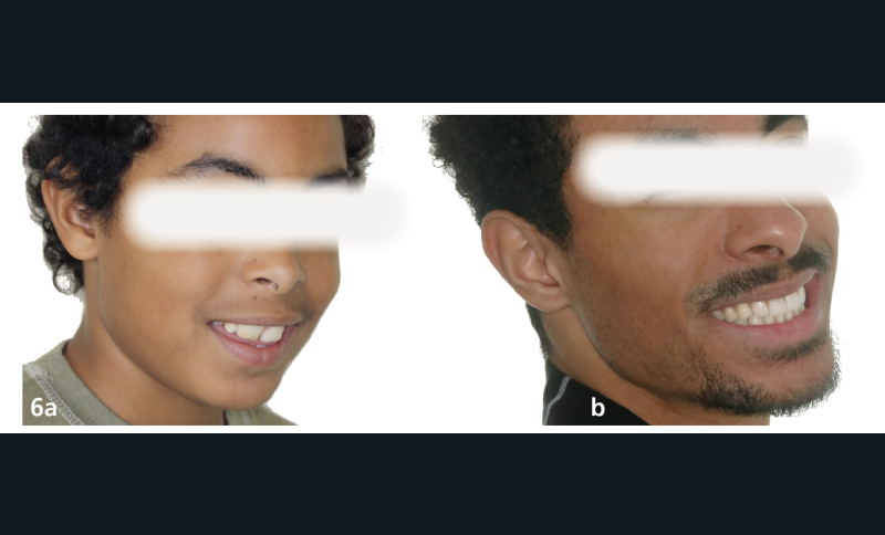 Plusieurs difficultés ont été rencontrées durant le traitement. L’impact psychologique des extractions d’incisives centrales a été lourd pour le patient, dont la promesse d’un sourire harmonisé a permis de surmonter cette épreuve. Ensuite, la gestion de la transposition était délicate. Il a fallu également accepter un rendu esthétique perfectible jusqu’à la fin de la croissance. La gestion de la dysharmonie dento-parodontale au niveau des incisives latérales et des canines était essentielle ; une correction parodontale et orthodontique, en jouant sur les informations de deuxième et troisième ordres, a permis une transition esthétique optimisée. L’outil de prévisualisation Digital Smile Design s’est en ce sens avéré très utile pour définir les impératifs propres à la prothèse (fig. 4a,b). Des frais pour la parodontie et la prothèse se sont enfin ajoutés aux dépenses orthodontiques (deux phases de traitement). Le rendu esthétique est satisfaisant en fin de traitement, avec une harmonisation du sourire et du profil (fig. 5 et 6). Les extractions n’ont pas appauvri le sourire. La qualité des réalisations prothétiques, l’environnement parodontal remanié et l’occlusion de fin de traitement font espérer un bon devenir dans le temps.