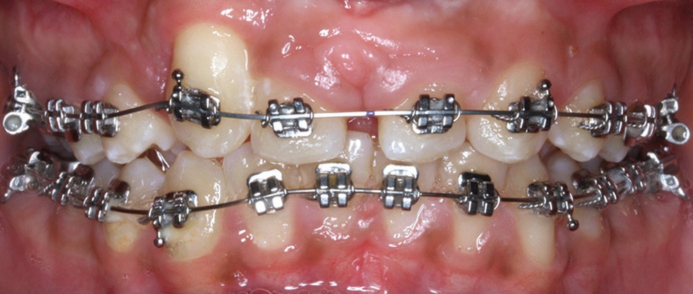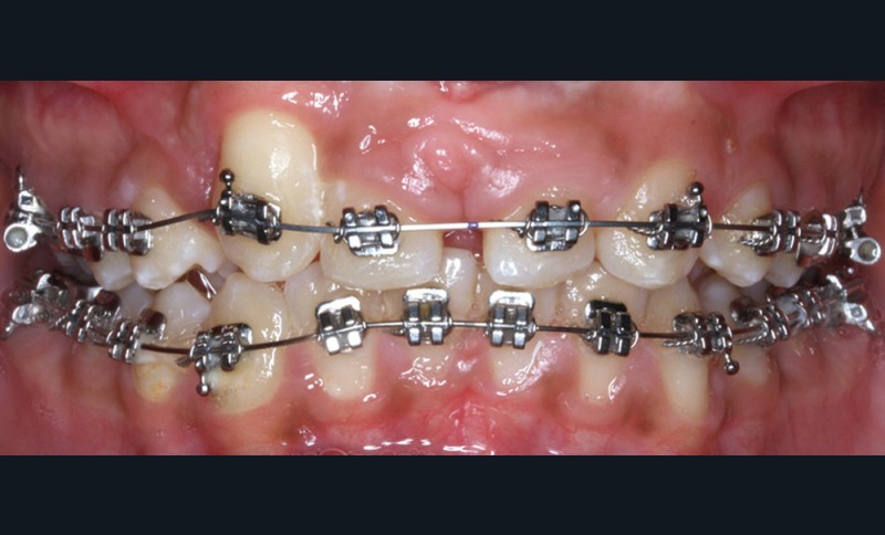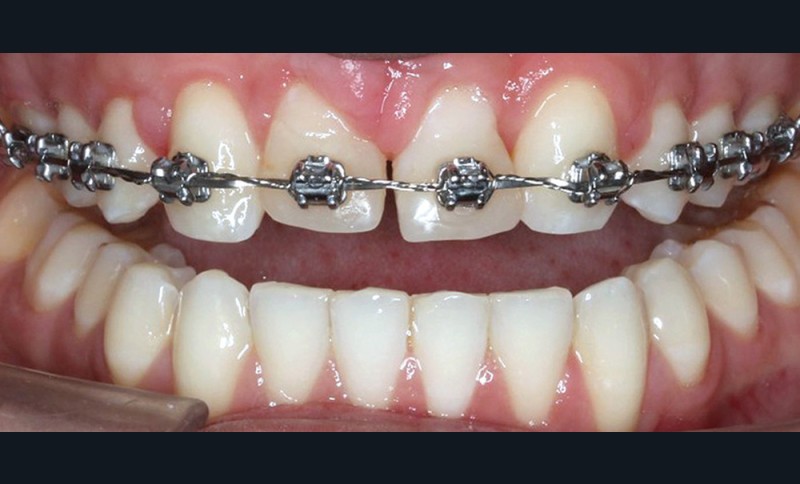 Le débaguage est réalisé au bout de 22 mois. Pour harmoniser la position des collets et redonner une hauteur coronaire acceptable aux nouvelles incisives centrales, une gingivectomie est effectuée, en accord avec le dentiste en charge des réalisations prothétiques. La croissance alvéolaire n’étant pas terminée, le rendu parodontal et esthétique évoluera. Ceci impose de différer la réalisation prothétique d’usage pour avoir un résultat stable dans le temps. Il est donc convenu de reprendre le traitement juste avant de réaliser les étapes prothétiques. Le traitement orthodontique comportant deux phases, les objectifs de finitions de la première phase sont abaissés pour réduire la durée globale de traitement.