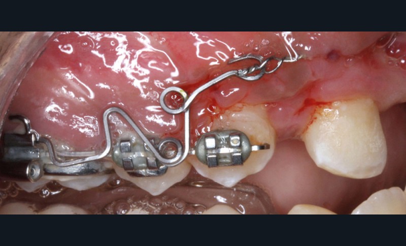 Dans un premier temps, l’extraction des 11 et 21 est réalisée. Un bouton est collé sur la 13, visible dans l’alvéole de la 11 afin de permettre sa désinclusion (fig. 2). La traction se fait à l’aide d’un arc TMA .016 x .022 en overlay afin d’avoir un axe de traction horizontal et vestibulaire évitant une résorption de la 12 à cette étape (fig. 3a,b) [3]. Ne pouvant pas mettre d’arc de Nance du fait de la position palatine des incisives latérales, il est convenu que des minivis d’ancrage peuvent être nécessaires si une perte d’ancrage postérieure est constatée (ce qui n’est pas le cas).