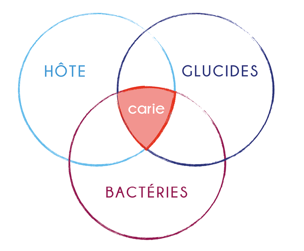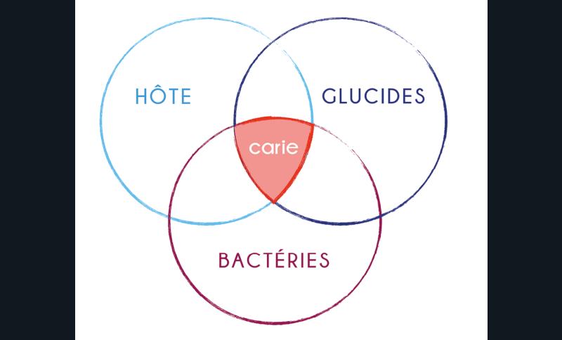 La carie résulte d’une interaction entre l’hôte, les bactéries cariogènes du biofilm et les glucides fermentables apportés par l’alimentation (fig. 1). Ces derniers sont métabolisés par les bactéries pour produire les acides responsables de la déminéralisation des tissus dentaires [2]. Privée de son apport en glucide, la carie stoppe son évolution. Le fait qu’une carie ne progresse plus lorsqu’une dent est extraite en est l’exemple le plus parlant.