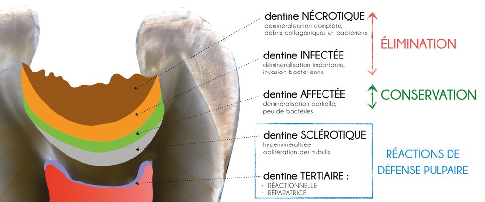 - La dentine infectée, dont l’architecture, encore reconnaissable, a été altérée par les bactéries acidogènes et protéolytiques que l’on y trouve. Ce tissu a perdu toute capacité de reminéralisation.