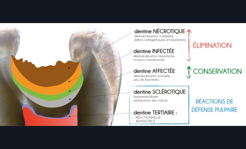 En présence de caries profondes, la majorité des praticiens recherche une élimination complète du tissu carieux. Cette attitude aboutit souvent à une effraction pulpaire qui aurait pu être évitée. Les recommandations actuelles sont en faveur d’un curetage sélectif qui vise à conserver la dent vitale et reminéraliser la dentine affectée.