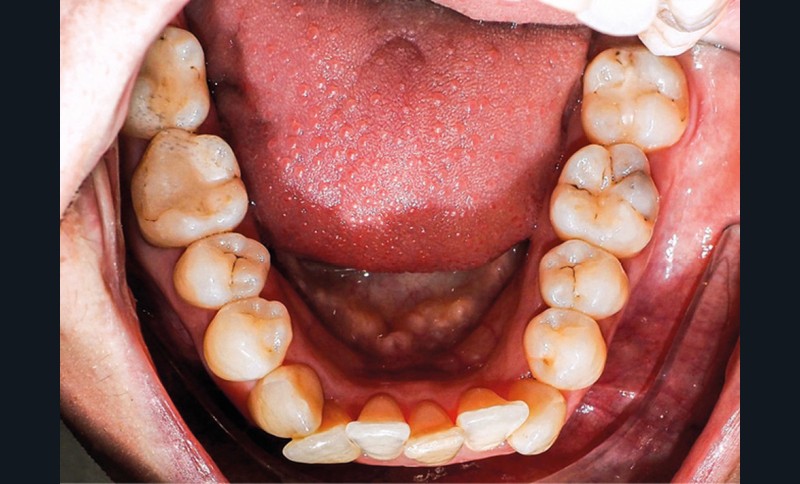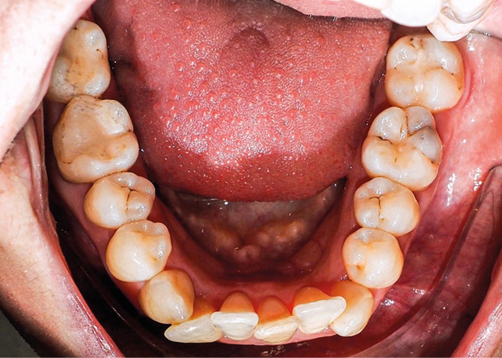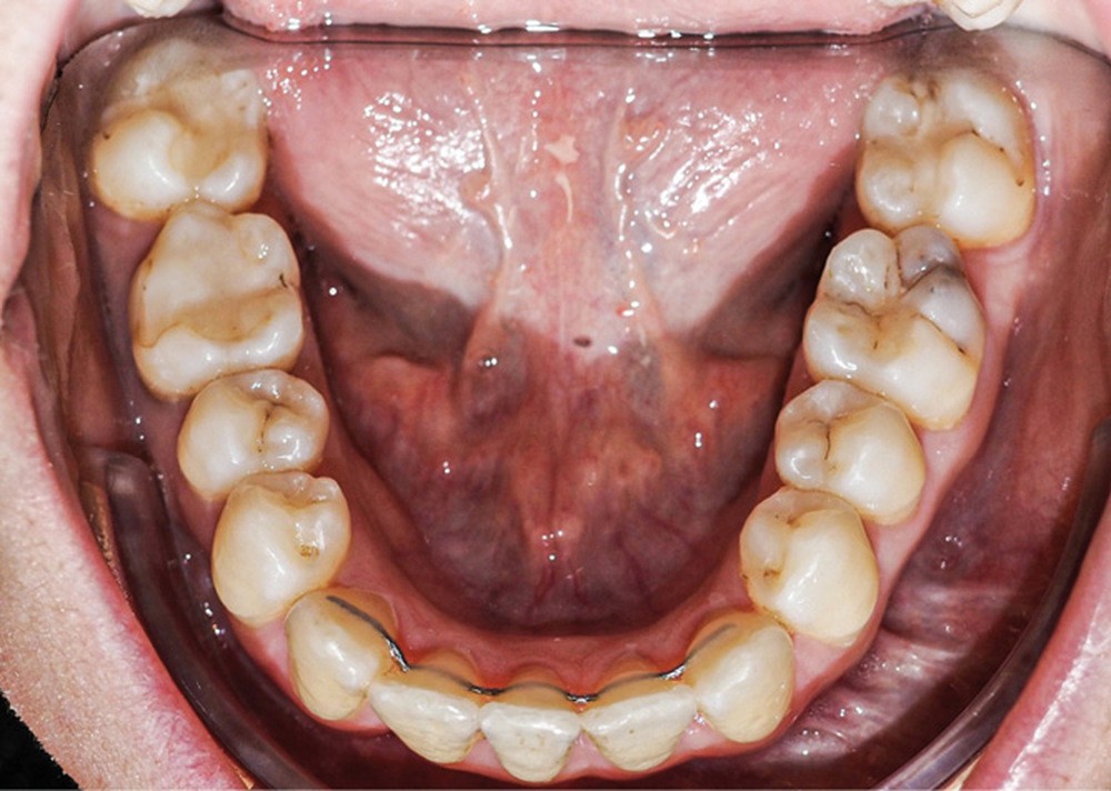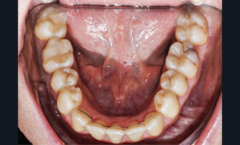 Des triangles noirs sont apparus à la mandibule suite à l’extraction de 31 : ils ne sont pas exposés lors du sourire, ce qui n’entraîne pas de défaut esthétique.