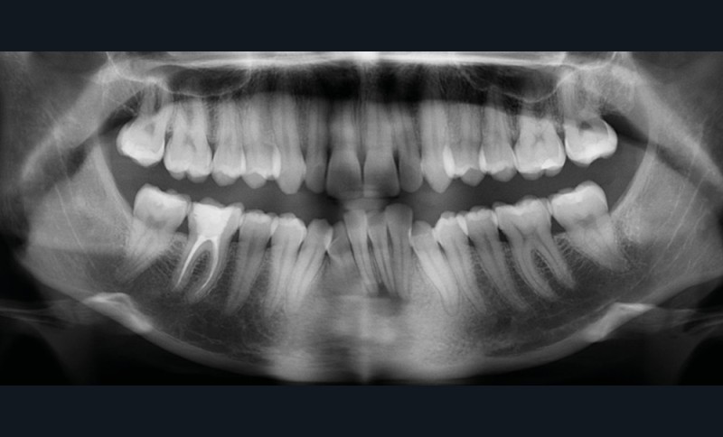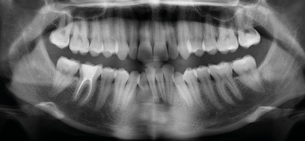 À la radiographie panoramique, 31 présente une importante image apicale, confirmée par une radiographie rétroalvéolaire et également visible sur la téléradiographie de profil.