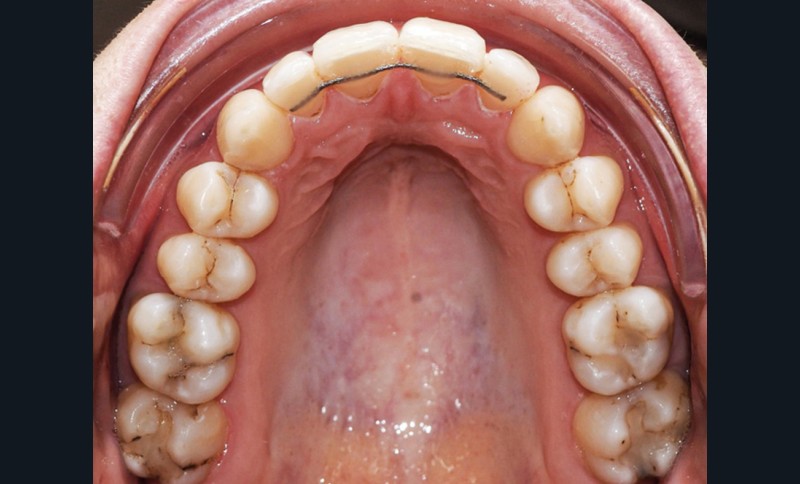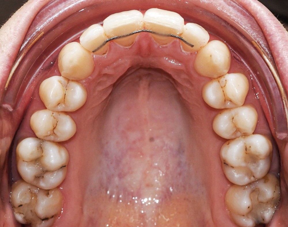 Après dépose du multi-attaches, des contentions collées ont été posées de 12 à 22 et de 33 à 43 et des gouttières thermoformées ont été ajoutées en complément en cas de problème avec les fils de contention.