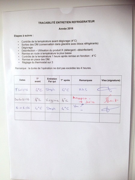 Par exemple, l’HAS recommande en cas d’utilisation d’un réfrigérateur pour la conservation des produits pharmaceutiques, de disposer d’un thermomètre intégré, ou à défaut d’y placer un thermomètre afin de maintenir une température conforme aux normes (≤ 4°C). Son entretien exige un dégivrage (si pas de dégivrage automatique) et un nettoyage avec un produit détergent-désinfectant ou un produit détergent suivi d’une désinfection (Hygiène et prévention du risque infectieux en cabinet médical ou paramédical – service des recommandations professionnelles) / Juin 2007).